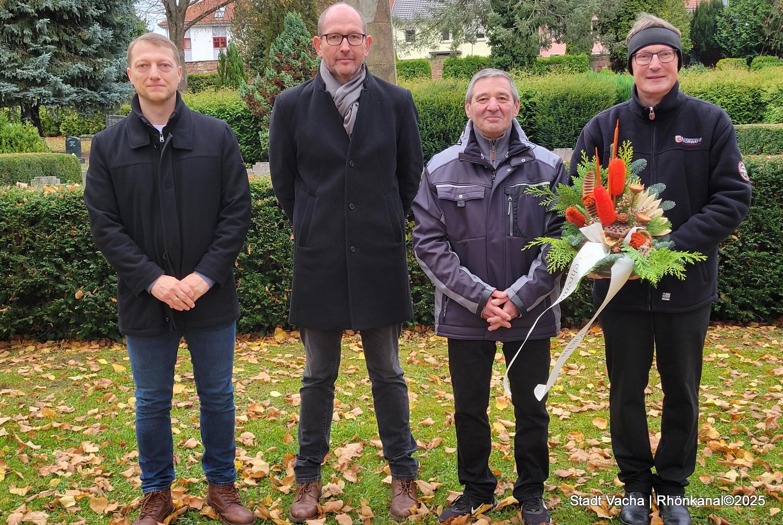 In Vacha gedachten gedachten die Stadträte Michael Wolf, Matthias Niebergall, Bürgermeister Martin Müller und Pfarrer Roland Jourdan am Volkstrauertag gemeinsam der Opfer von Krieg und Gewalt.
