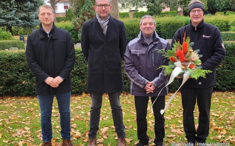 Bei einer stillen Zeremonie auf dem Friedhof Vacha legten sie Trauergestecke am Mahnmal für die am 3. April 1945 gefallenen Deutschen sowie am Denkmal für die gestorbenen sowjetischen Kriegsgefangenen nieder.