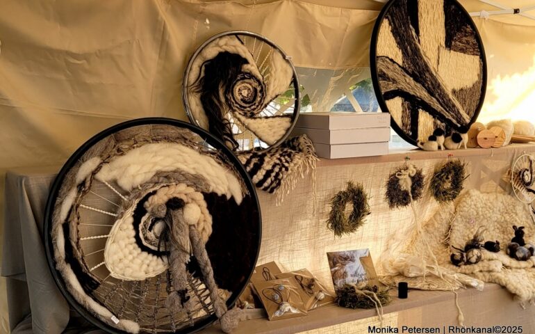 Dennoch zeigt Monika in ihrer Ausstellung ab dem 22. November im Haus der Langen Rhön, was alles mit dieser wertvollen Naturfaser möglich ist: Stricken oder Weben von Sitzkissen, Ponchos, Pullis, Decken und Wollsocken. Ihre Webbilder aus Schafwolle – Motive wie Blumen und Schafe – erzählen von der Natur der Rhön.
