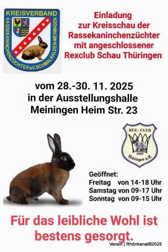 Der Kreisverband der Rassekaninchenzüchter aus Schmalkalden-Meiningen lädt vom 28. bis 30. November 2025 herzlich zur Kreisschau ein.