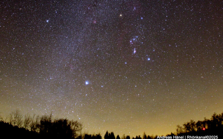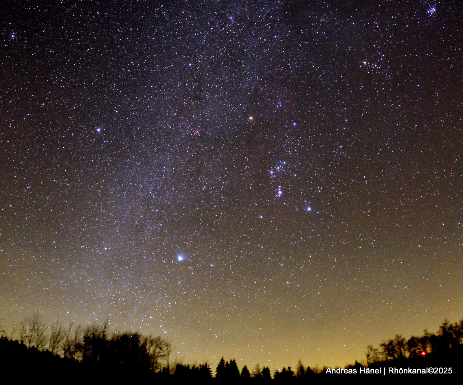 Wandert der Blick Richtung Osten, wird auffallen, dass die gesamte östliche Himmelshälfte nun reich an hellen Sternen ist. Und auch dort gibt es Weihnachtsbeleuchtung ohne Strom – wie die auffälligen Plejaden oder der offene Sternhaufen der Hyaden rund um den Stern Aldebaran im Stier oder der markante Himmelsjäger Orion.