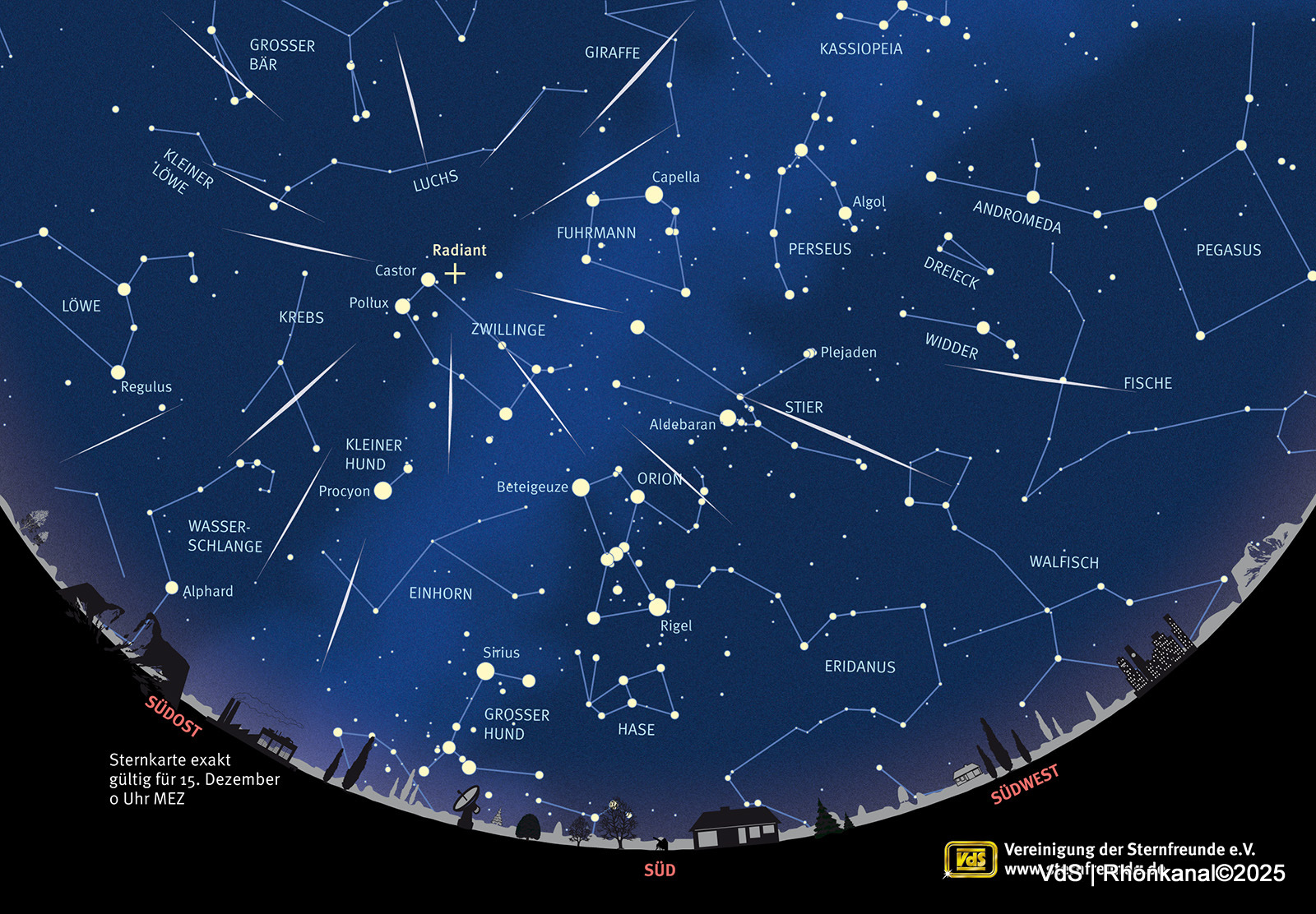 Wer sich nicht selbst mit leuchtenden Plastikprodukten den Sternenhimmel raubt, für den bietet der Dezember einen der spektakulärsten Meteorströme: die Geminiden mit ihrem Fluchtpunkt im Sternbild der Zwillinge, lateinisch Gemini.