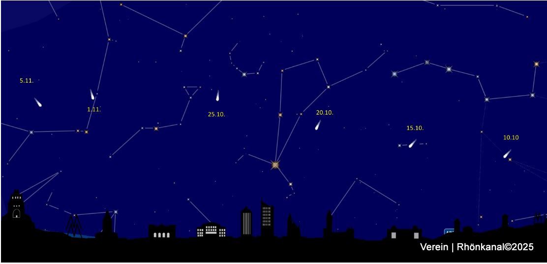 Und so lohnt sich gleich zu Beginn des Einbruchs der Dunkelheit – die mittlerweile schon zu Feierabend hereinbricht – der Blick nach Südwesten. Dort ist noch bis in die erste November-Woche hinein der Komet mit Namen C/2025 A6 Lemmon zu sehen.