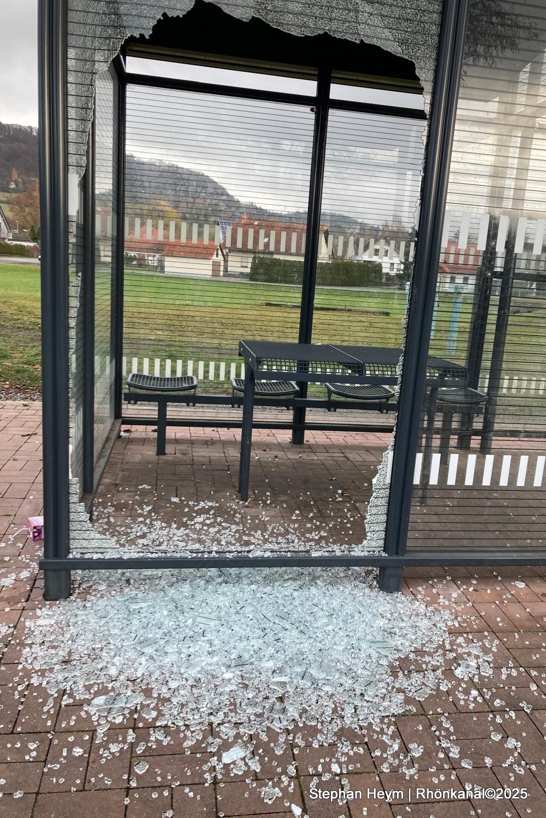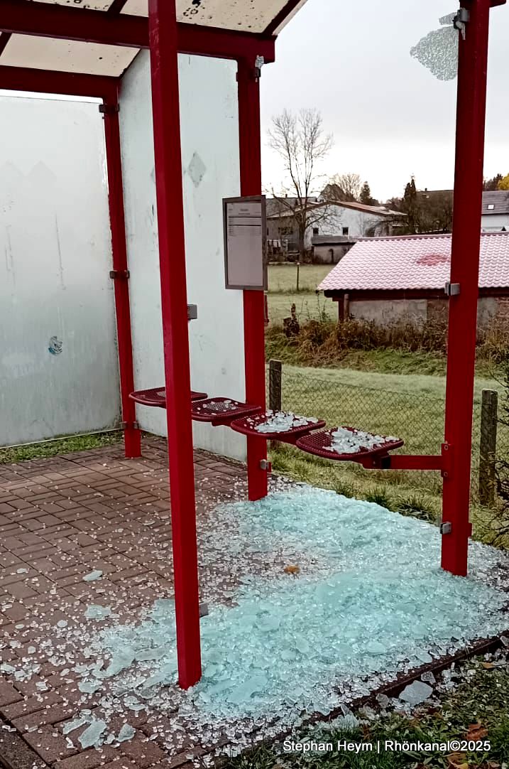 Bislang unbekannte Täter warfen unter anderem am Bushäuschen an der Busschleife in der Nähe des REWE-Marktes eine Scheibe ein. Auch die erst ein Jahr alte Bushaltestelle an der Aue wurde am helllichten Tag beschädigt.