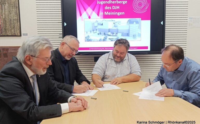 Die Stadt Meiningen hat einen wichtigen Schritt in Richtung Zukunft getan: Am Dienstagnachmittag unterzeichneten Bürgermeister Fabian Giesder, Siegfried Wetzel (Vorstand der Thüringer Jugendherbergen gGmbH), Bertram Tittel (Geschäftsführer des DJH Landesverband Thüringen e.V.) sowie Roland Fries (Eigentümer der Mittelmühle) eine gemeinsame Absichtserklärung zum Bau einer Jugendherberge in Meiningen.