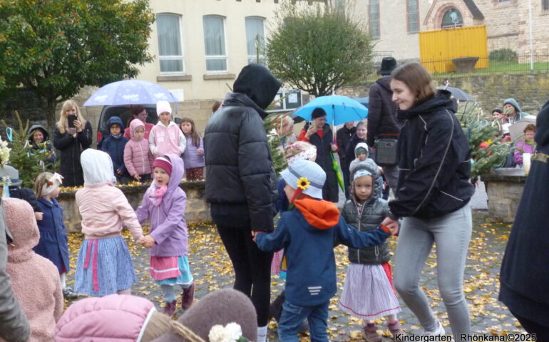 Gemeinsam mit den Kirmesmädchen, guter Laune und lauter Musik wurde unter der Linde mitten im Ort ein Kirmestänzen gewagt. Einige Zuschauer hatten sich trotz des Nieselregens zusammengefunden.