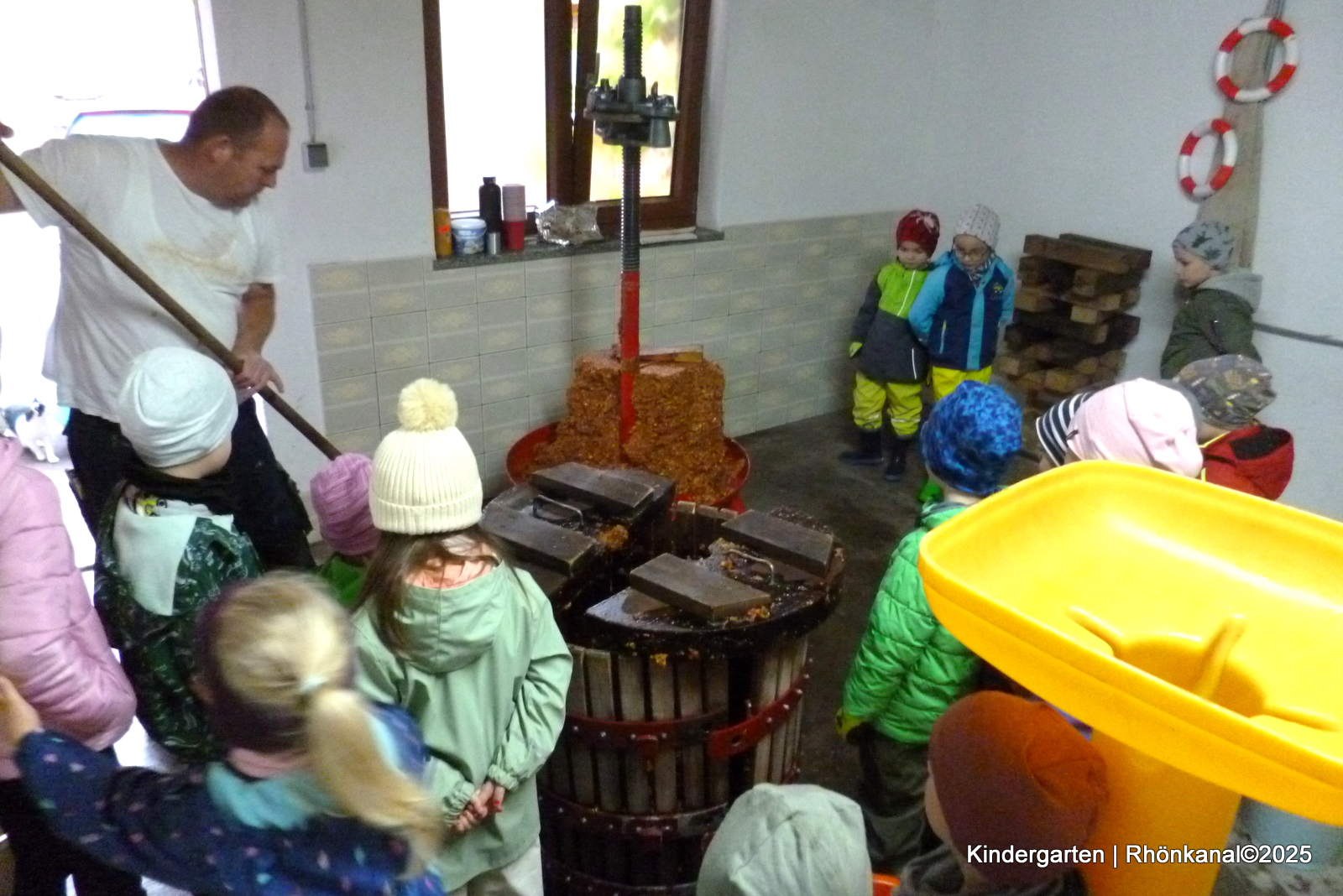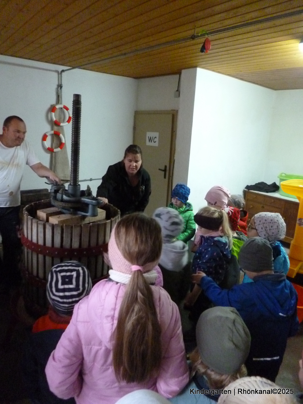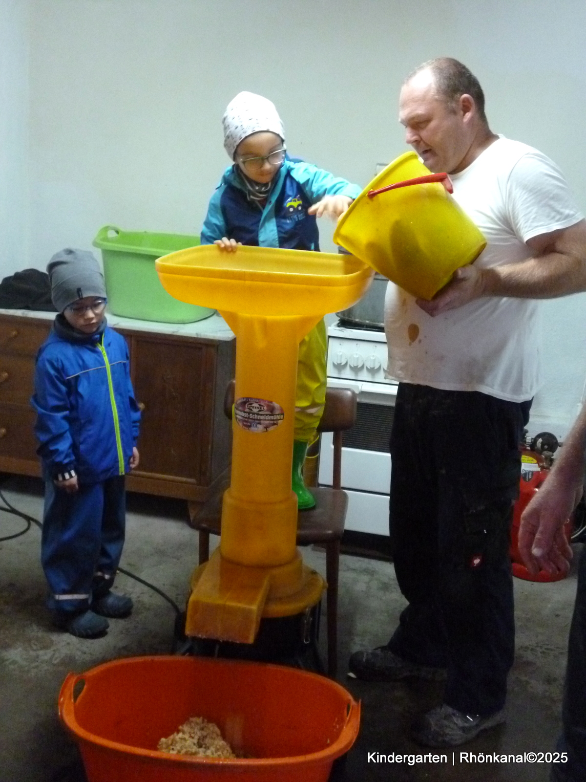 Sie hatten so die Gelegenheit hautnah mitzuerleben, wie viele Arbeitsschritte notwendig sind, bis der leckere Saft im Glas ist. Schon seit vielen Jahren unterstützen Evelyn und Andreas Veltum unseren Kindergarten mit dieser tollen Aktion ehrenamtlich.
