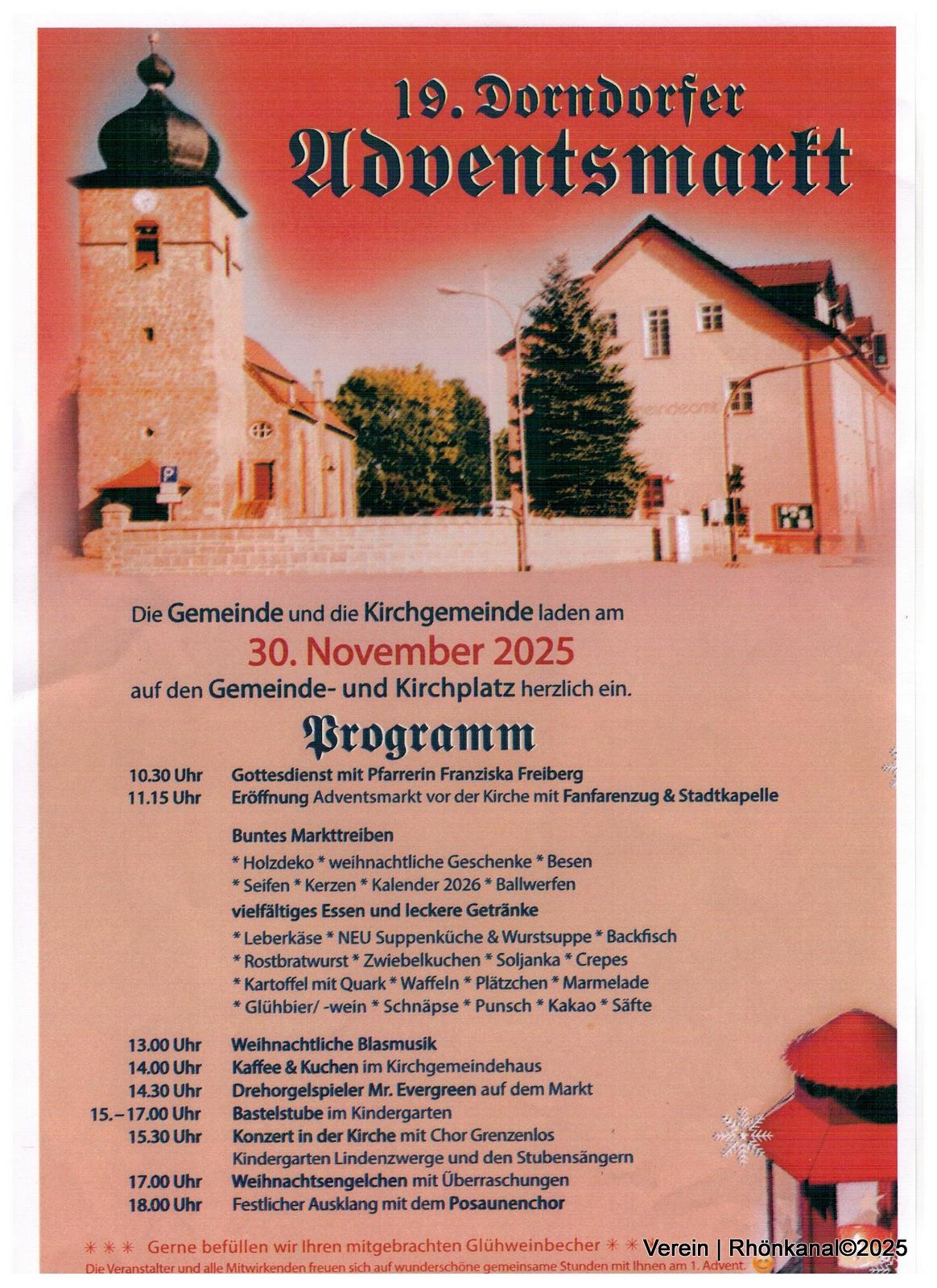 In Dorndorf (Rhön) findet am 1. Advent der 19. Dorndorfer Adventsmarkt auf dem Gemeinde- und Kirchplatz statt. Seit vielen Jahren ist die Veranstaltung ein Anziehungspunkt in unserer Region.