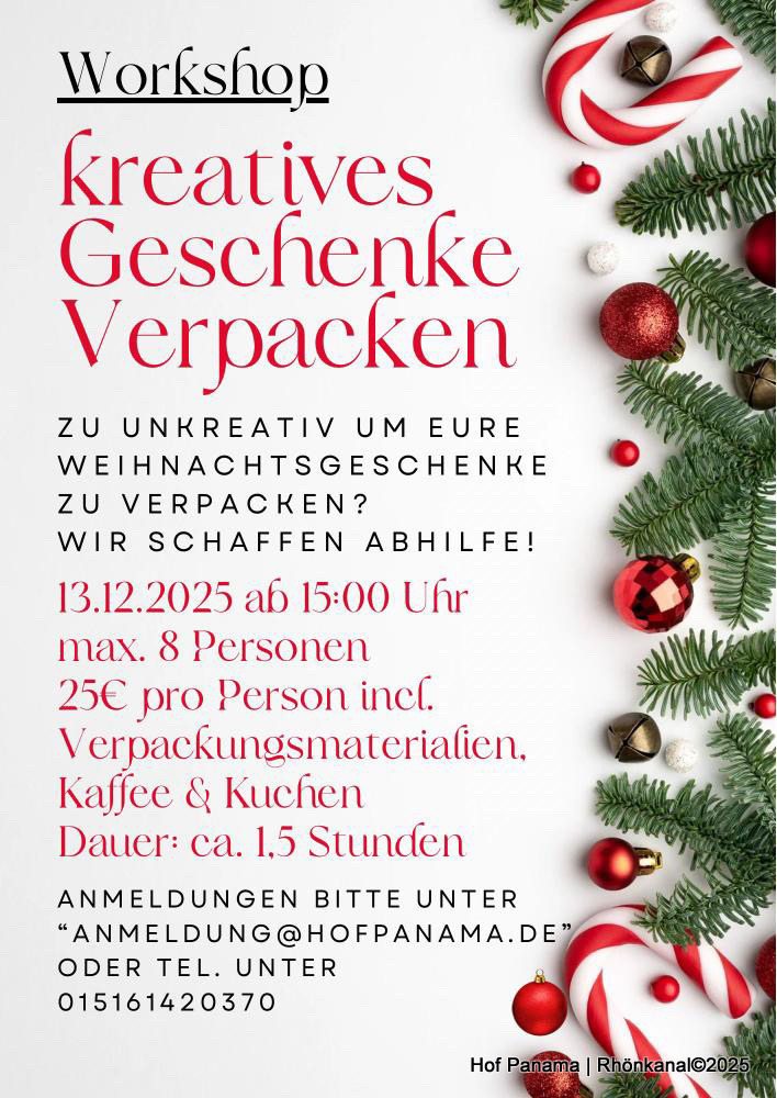 Am Samstag, den 13. Dezember 2025, findet auf dem Hof Panama in Hilders ein Workshop zum Thema „Kreatives Geschenkeverpacken“ statt.