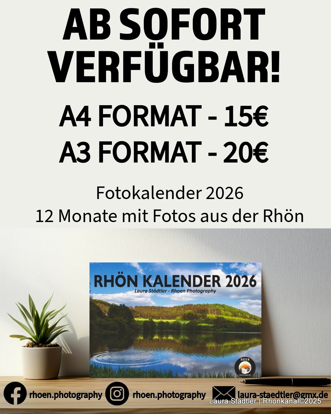 Der Kalender kostet im A4-Querformat 15 Euro, im A3-Querformat 20 Euro und kann per Mail an laura-staedtler@gmx.de oder über Facebook und Instagram (@rhoen.photography) bestellt werden.
