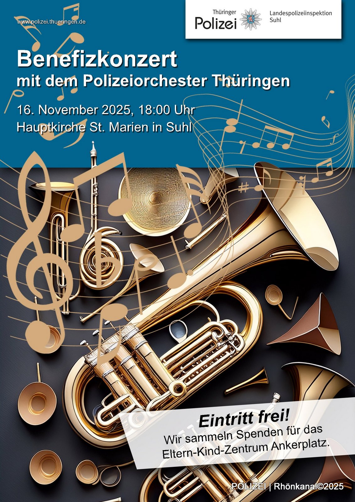 Am Sonntag, den 16. November 2025 findet das traditionelle Benefizkonzert der Landespolizeiinspektion Suhl ab 18 Uhr in der Suhler Hauptkirche St. Marien statt.