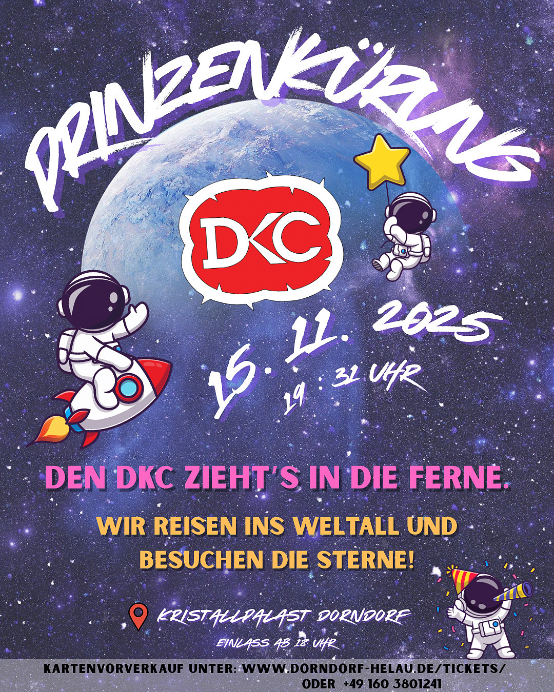 Am Samstag, den 15. November 2025, findet die Prinzenkürung beim Dorndorfer Karneval statt. Beginn ist um 19.31 Uhr im bunt geschmückten Kulturhaus/Kristallpalast in Dorndorf (Lange Straße 7).