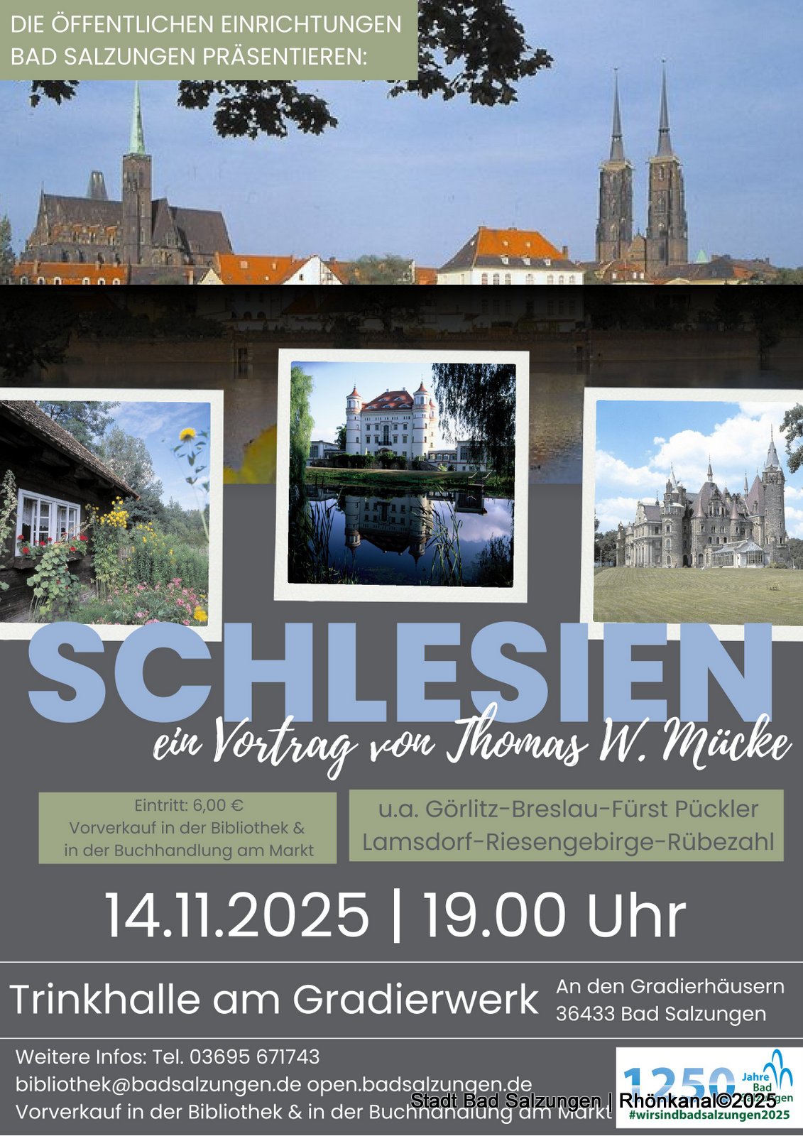 Thomas und Nina W. Mücke und die Öffentlichen Einrichtungen der Stadt Bad Salzungen laden dazu ein, Schlesien neu zu entdecken – mit offenen Augen, Ohren und Herzen am Freitag, den 14. November 2025 um 19 Uhr in der Trinkhalle am Gradierwerk in Bad Salzungen.
