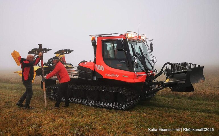 Gemeinsam waren sie mit der Pistenraupe unterwegs, um 09zu setzen. Wer das schon einmal gesehen hat, weiß: Das hat etwas von Rhöner Orientierungslauf auf Profi-Niveau. Man sieht kaum die Hand vor Augen, aber jeder Pfosten steht am Ende da, wo er hingehört.