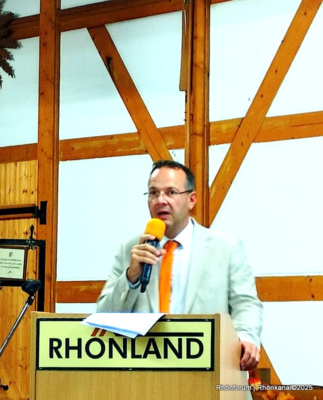 Nach der Begrüßung durch den Rhönforum-Vorsitzenden Martin Henkel richtete Heiko Burger, Vorstand der Agrargenossenschaft Rhönland eG, ein Grußwort an die Teilnehmer. Gemeinsam mit Thomas Malsch leitet er das Unternehmen, das neben Tierzucht, Feldbewirtschaftung, Biogasanlage und Nudelproduktion auch die Rhönlandscheune betreibt.
