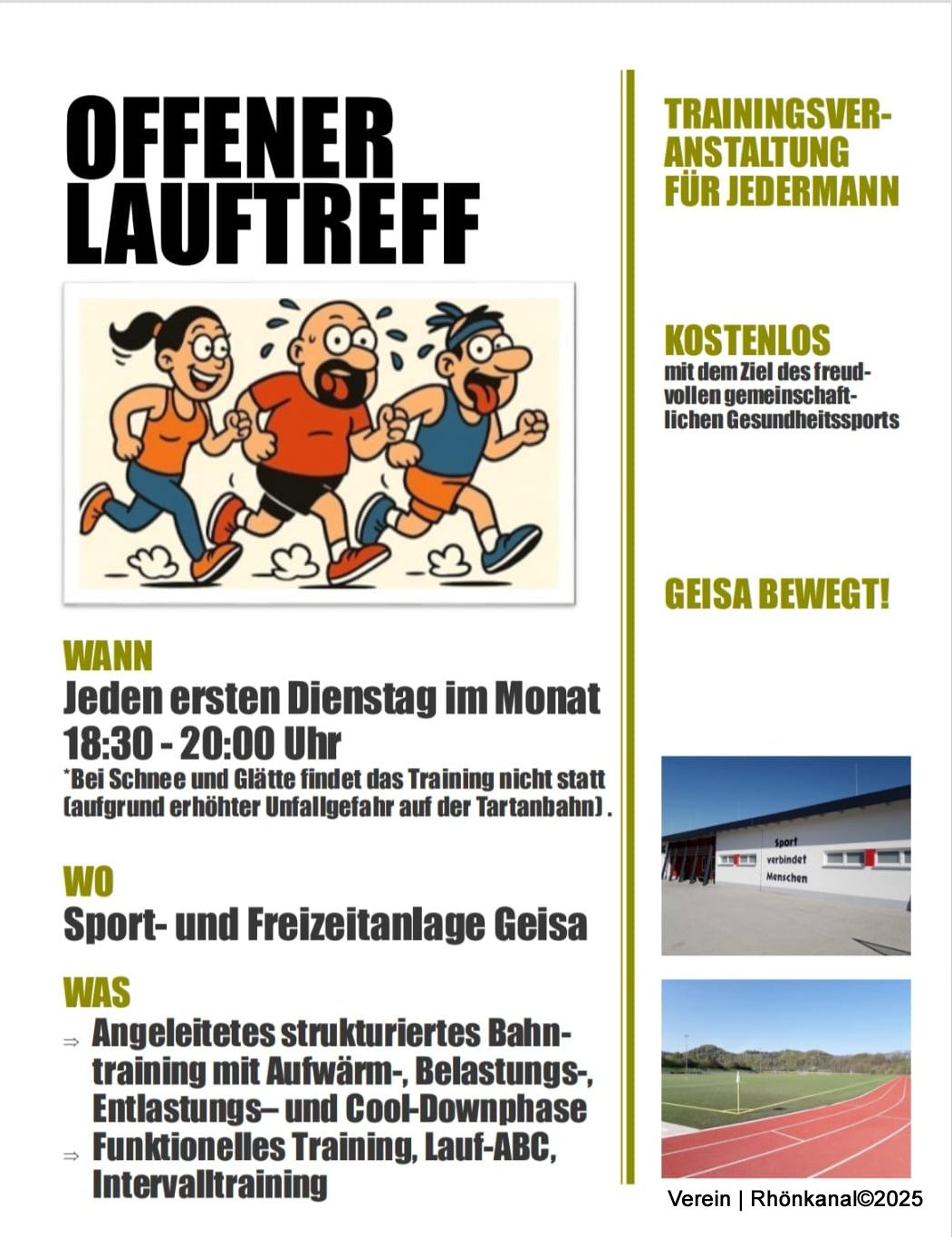 Ab Dienstag, den 4. November 2025, startet auf der Sportanlage in Geisa der monatliche Offene Lauftreff. Dieser findet an jedem ersten Dienstag im Monat um 18.30 Uhr statt.