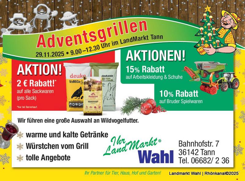 Es wird gemütlich bei uns in Tann! Kommt vorbei zum Adventsgrillen am 29.11.2025 von 9 bis 12:30 Uhr im Landmarkt Wahl und genießt die vorweihnachtliche Stimmung bei warmen und kalten Getränken sowie leckeren Würstchen vom Grill.