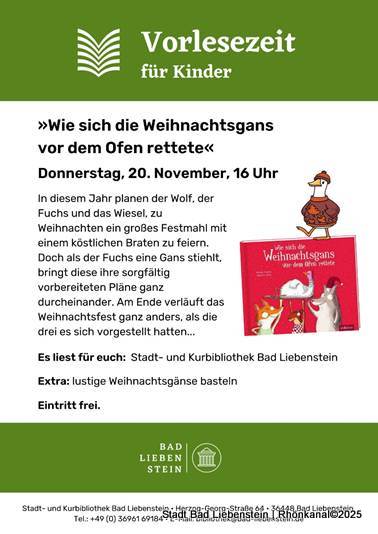In der November-Vorlesezeit lädt die Stadt- und Kurbibliothek Bad Liebenstein am Donnerstag, den 20. November 2025, alle großen und kleinen Zuhörer schon einmal zur gemütlichen Einstimmung auf Advent und Weihnachten ein – mit der Geschichte der schlauen Weihnachtsgans.