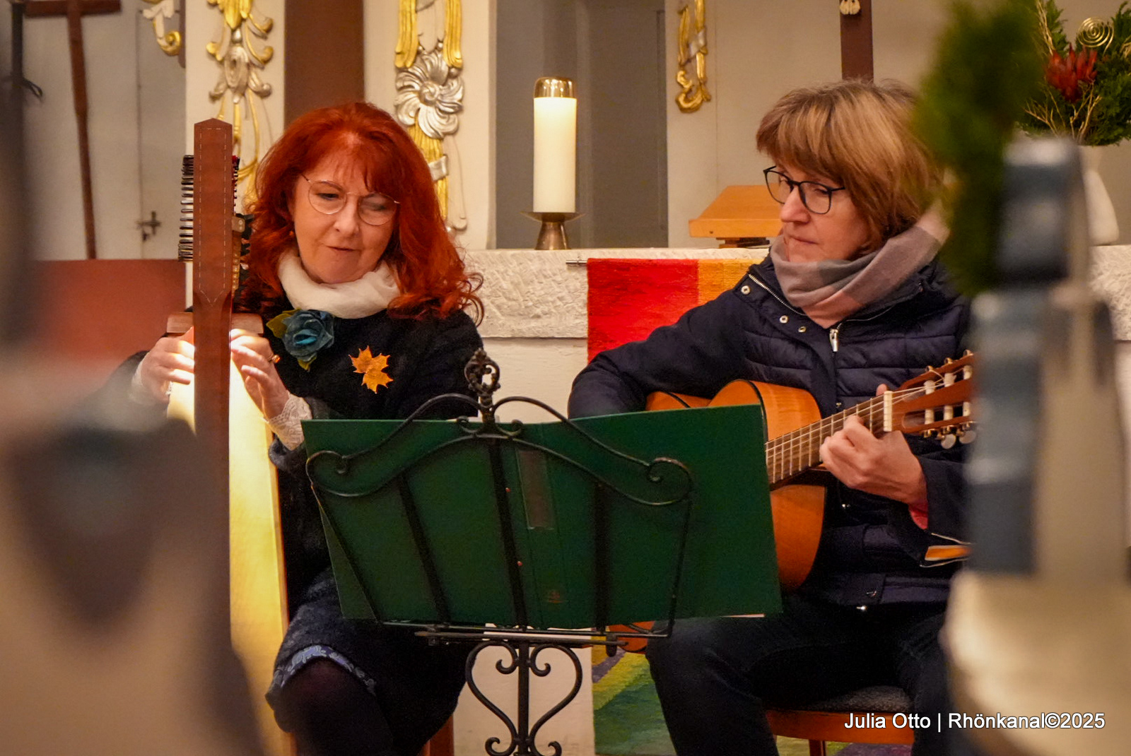 Nach einer kurzen Adventsandacht von Heike Straube stellte das Duo Bettina Thüring (Harfe) und Margit Hugk (Metalltrommel/Gitarre) sein Projekt „Zeit schenken“ vor und bot besinnliche Musik dar.