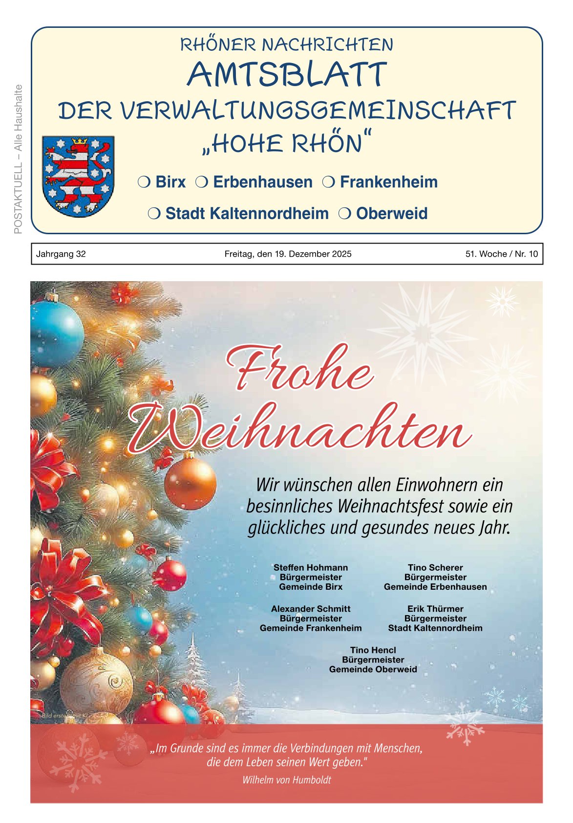 Das Amtsblatt der Verwaltungsgemeinschaft „Hohe Rhön“ mit den Gemeinden Birx, Erbenhausen, Frankenheim, Stadt Kaltennordheim und Oberweid.