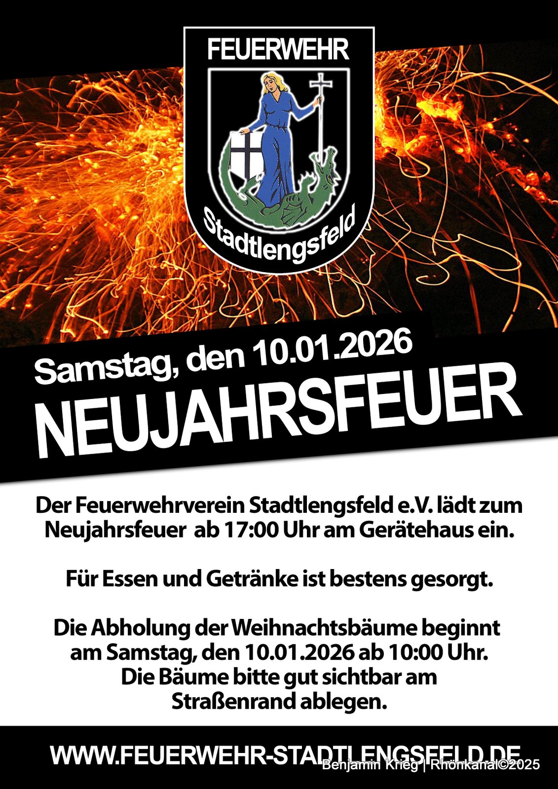 Der Feuerwehrverein Stadtlengsfeld e.V. lädt die Bürgerinnen und Bürger sowie alle Interessierten herzlich zum traditionellen Neujahrsfeuer ein.