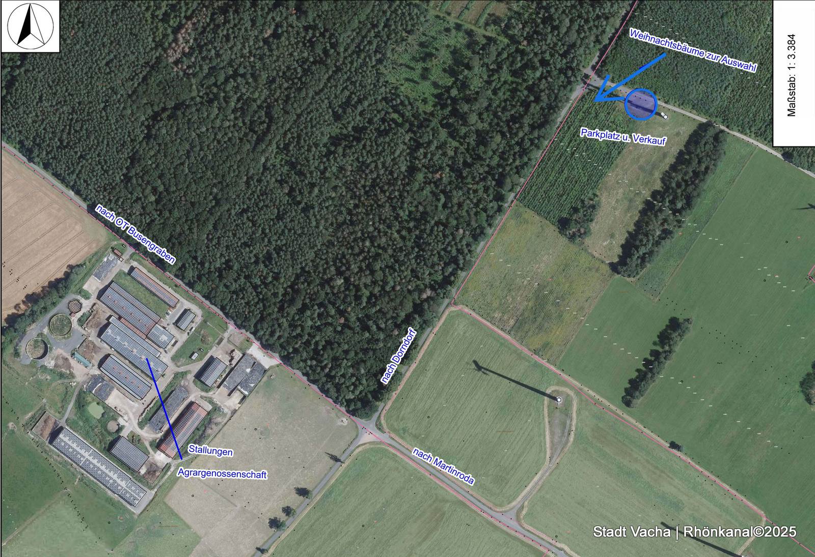 In diesem Jahr bietet das Forstamt, speziell der zuständige Revierleiter, frische Weihnachtsbäume aus dem heimischen Wald zwischen den Vachaer Ortsteilen Busengraben und Martinroda an (siehe Luftbild).