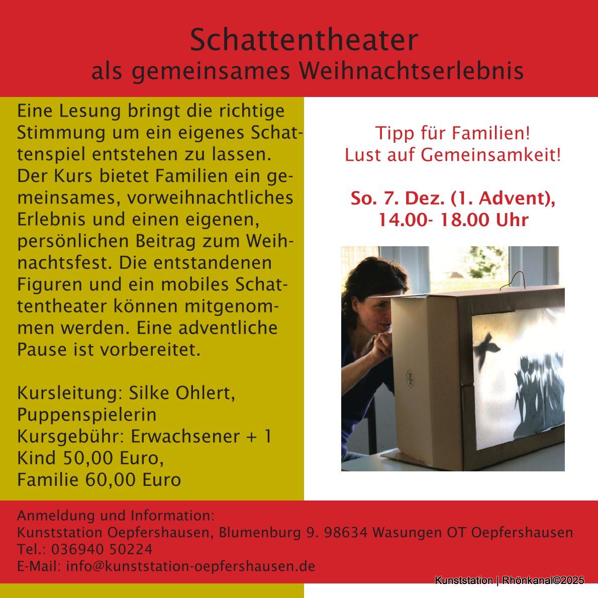 Am Sonntag, den 7. Dezember 2025, findet in der Kunststation Oepfershausen der Workshop „Schattentheater“ statt - Ein besonderer Tipp für Familien als gemeinsames Weihnachtserlebnis.