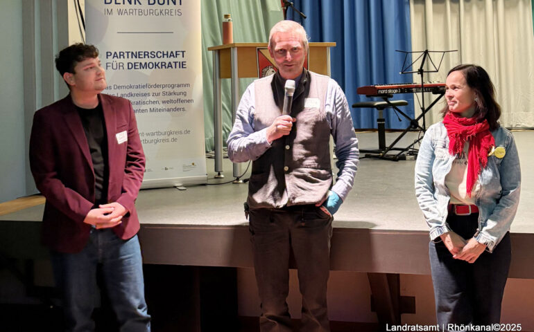 Eröffnet wurde die Konferenz gemeinsam von Kevin Rodeck (Landratsamt Wartburgkreis) und Simon Ortner (Partnerschaft für Demokratie Wartburgkreis) mit Diana Lapp („KulturZeit“ des SV Kali Unterbreizbach e.V.).