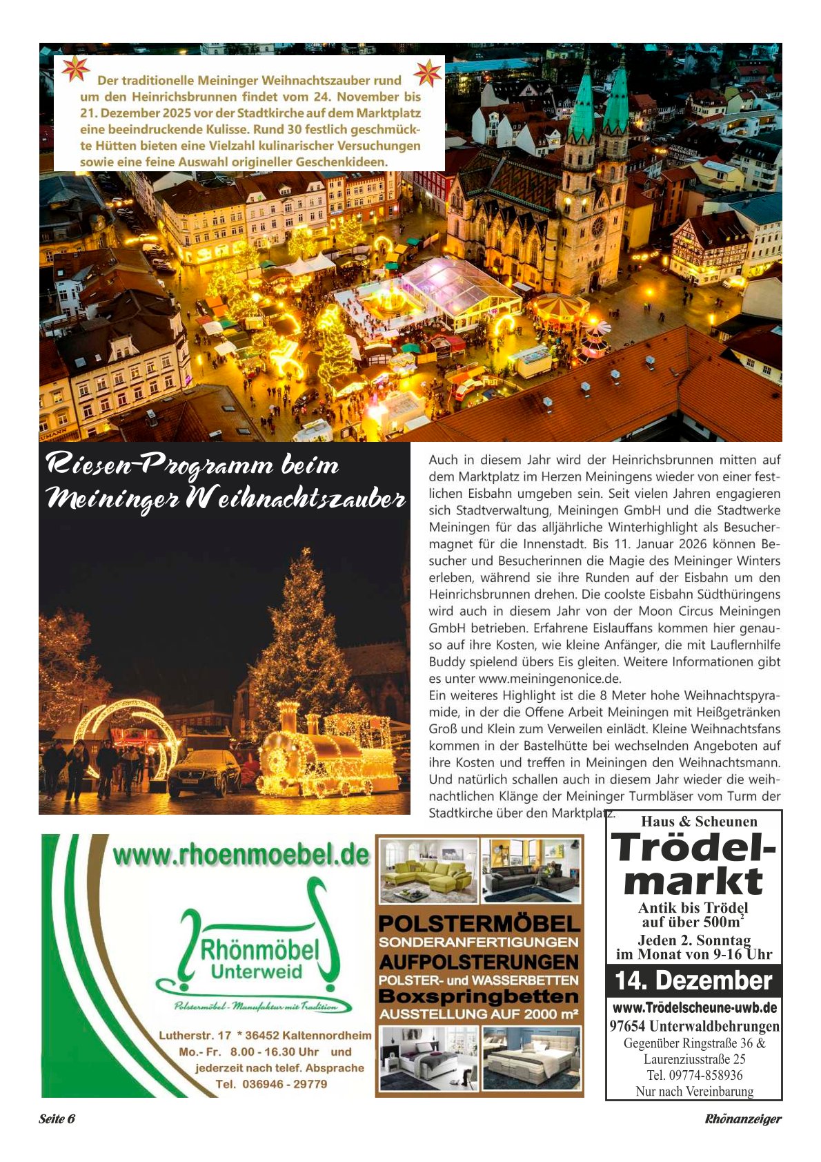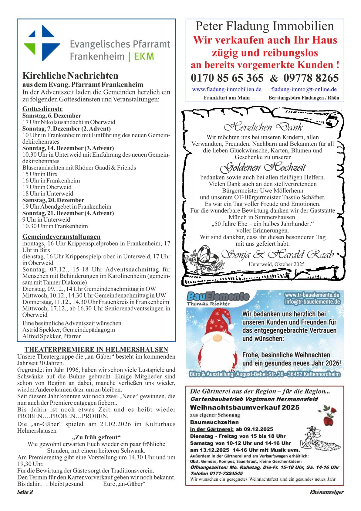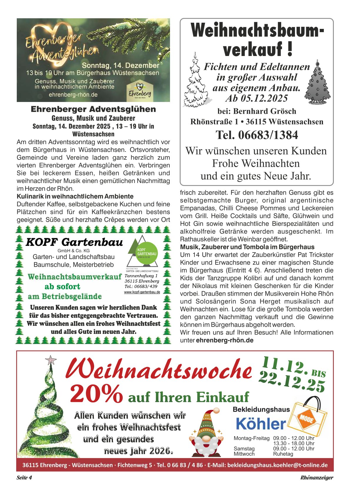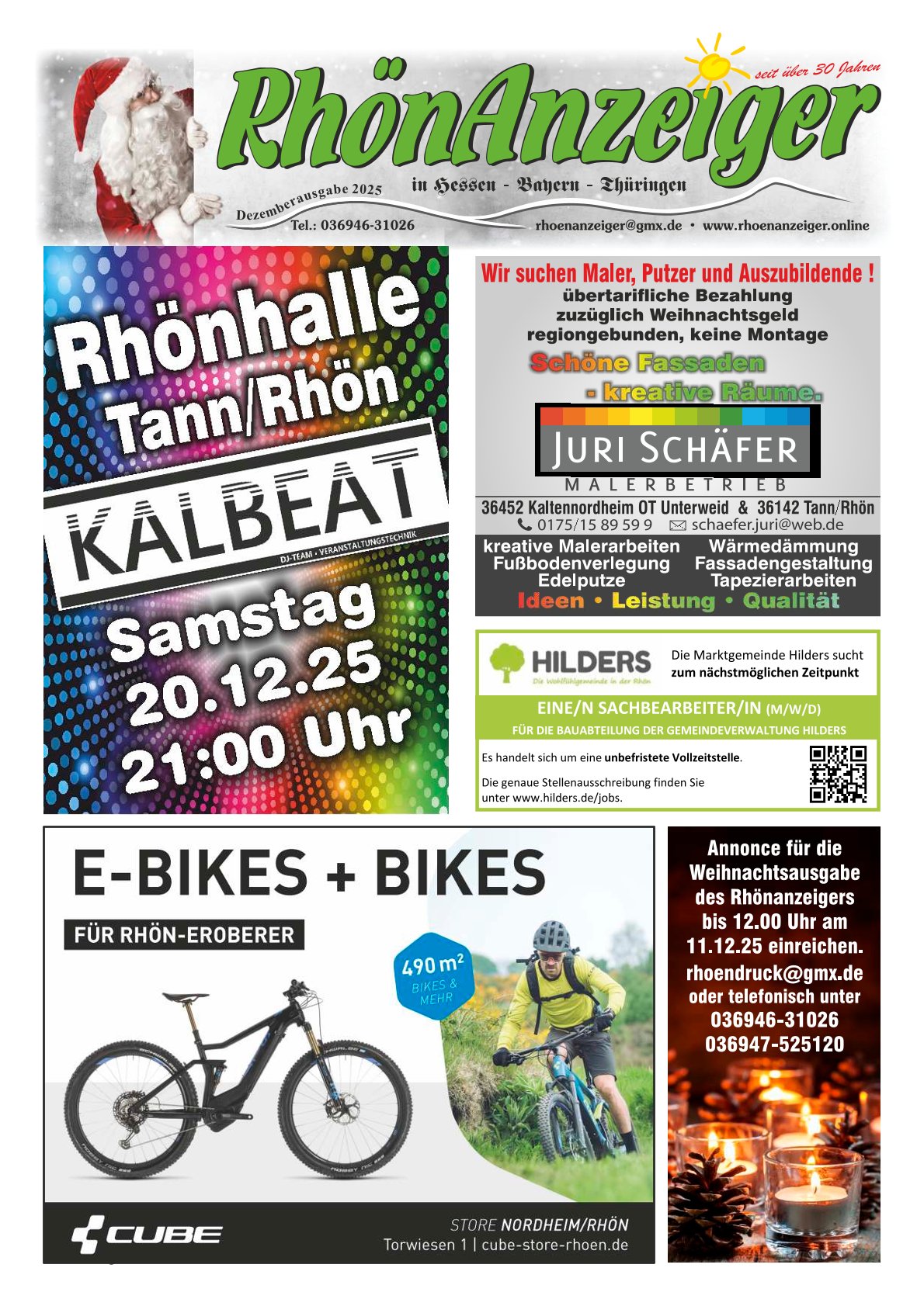 Der neue RhönAnzeiger ist da: Dezember-Ausgabe 2025 Posted by Redaktion6. Dezember 2025 Der beliebte RhönAnzeiger aus der Region für Euch! Informiert Euch über Gewerbebetriebe, Veranstaltungen und privaten Anzeigen. Perfekt anschauen mit der kostenlosen Rhönkanal App!