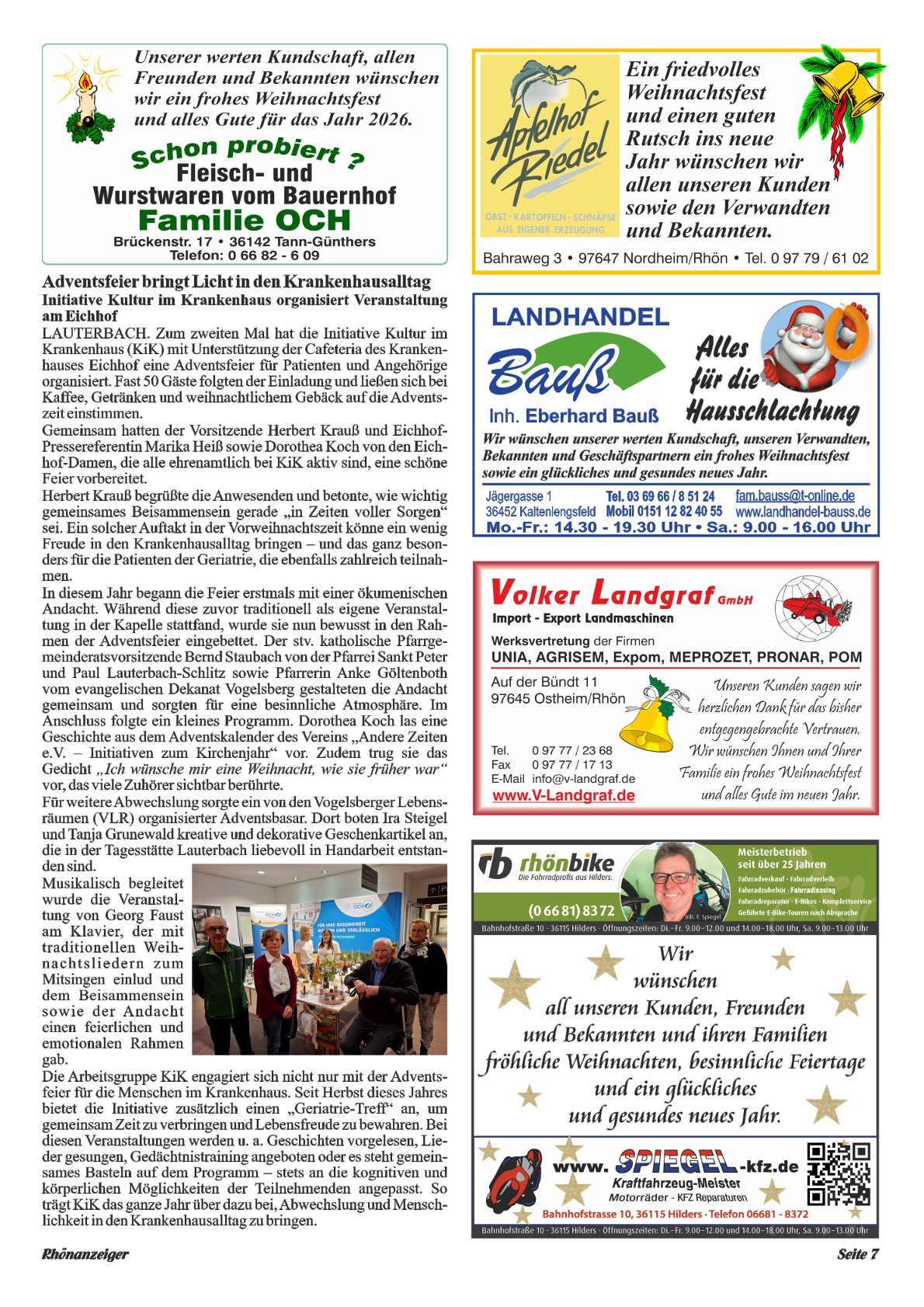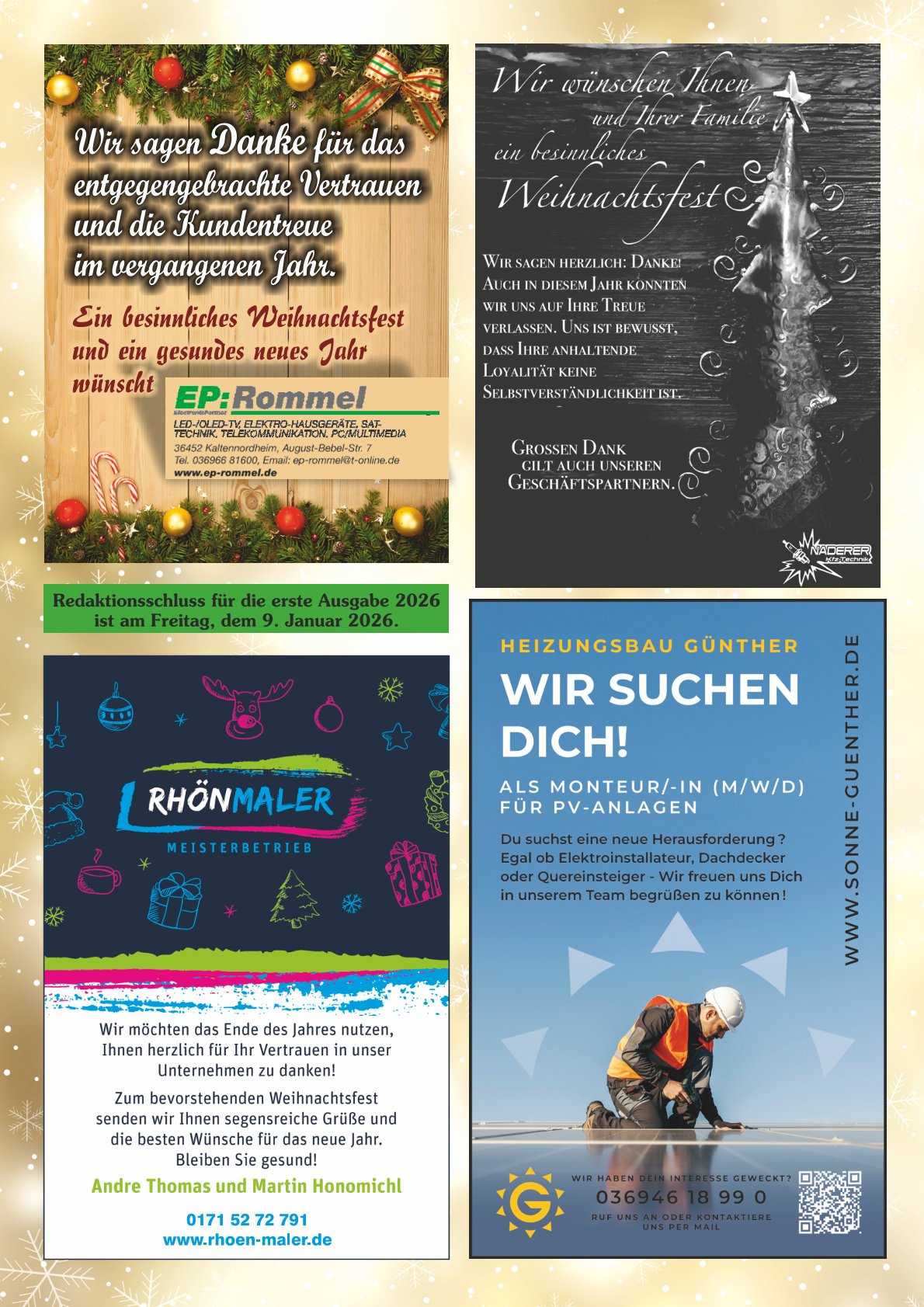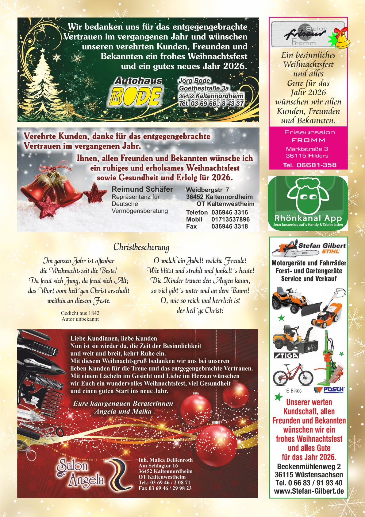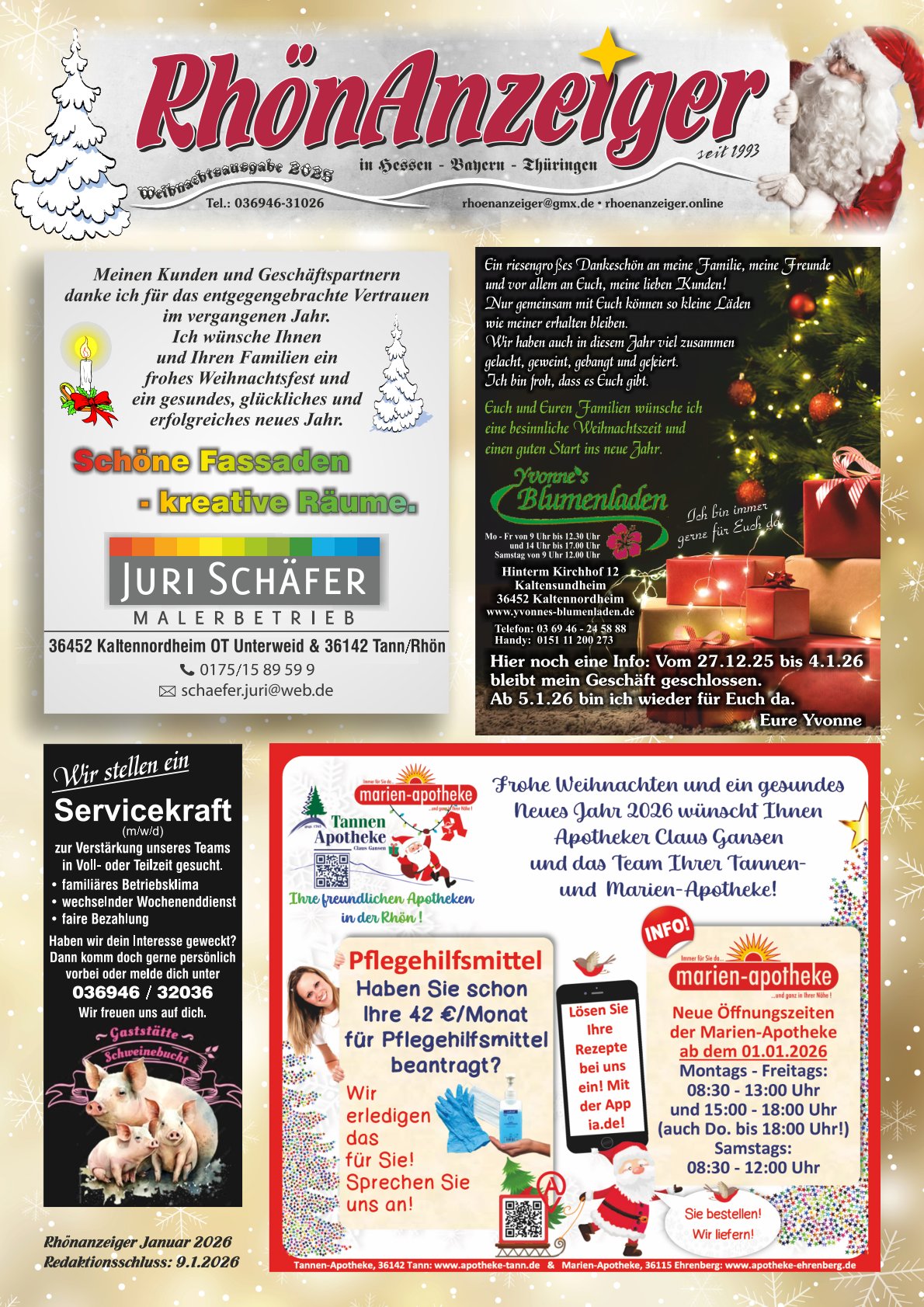 Der neue RhönAnzeiger ist da: Weihnachts-Ausgabe 2025 Posted by Redaktion15. Dezember 2025 Der beliebte RhönAnzeiger aus der Region für Euch! Informiert Euch über Gewerbebetriebe, Veranstaltungen und privaten Anzeigen. Perfekt anschauen mit der kostenlosen Rhönkanal App!