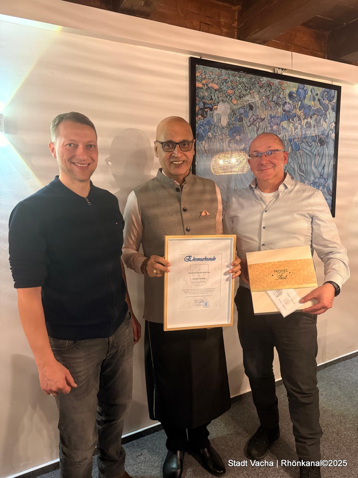 Bürgermeister Martin Müller betonte in seiner Gratulation: „Ravinder Singh ist seit vielen Jahren ein verlässlicher Partner der Stadt Vacha und ihrer Vereine. Die Stadt ist stolz und dankbar, einen so engagierten und erfolgreichen Gastwirt in ihren Reihen zu haben.“