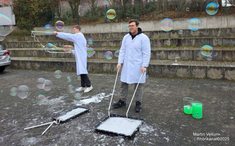Bereits am Empfang wurden die Gäste freundlich und kompetent von den Gymnasiasten Clemens Hohmann und Konrad Reifert aus der Klasse E1G1 willkommen geheißen. Ein farbenfroher Blickfang waren beeindruckende Riesenseifenblasen, vorbereitet vom Leistungskurs.