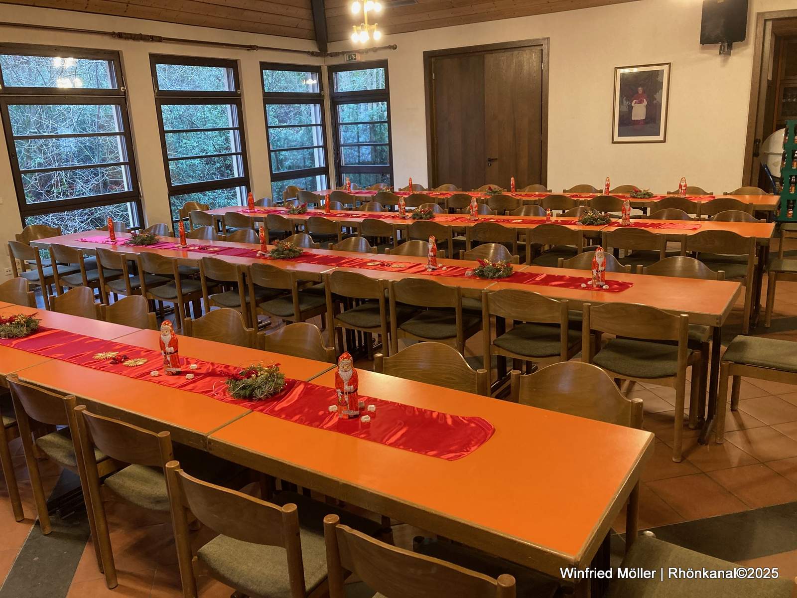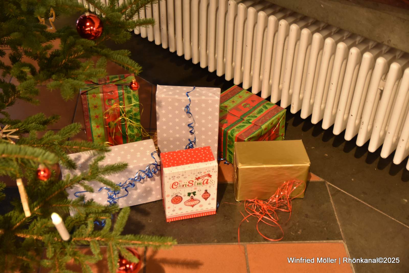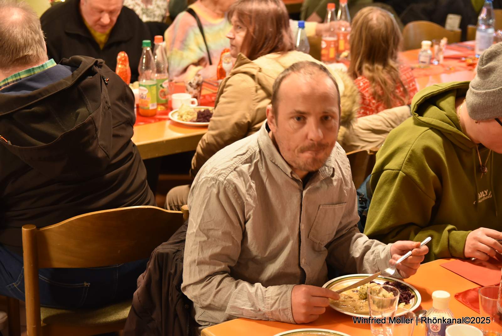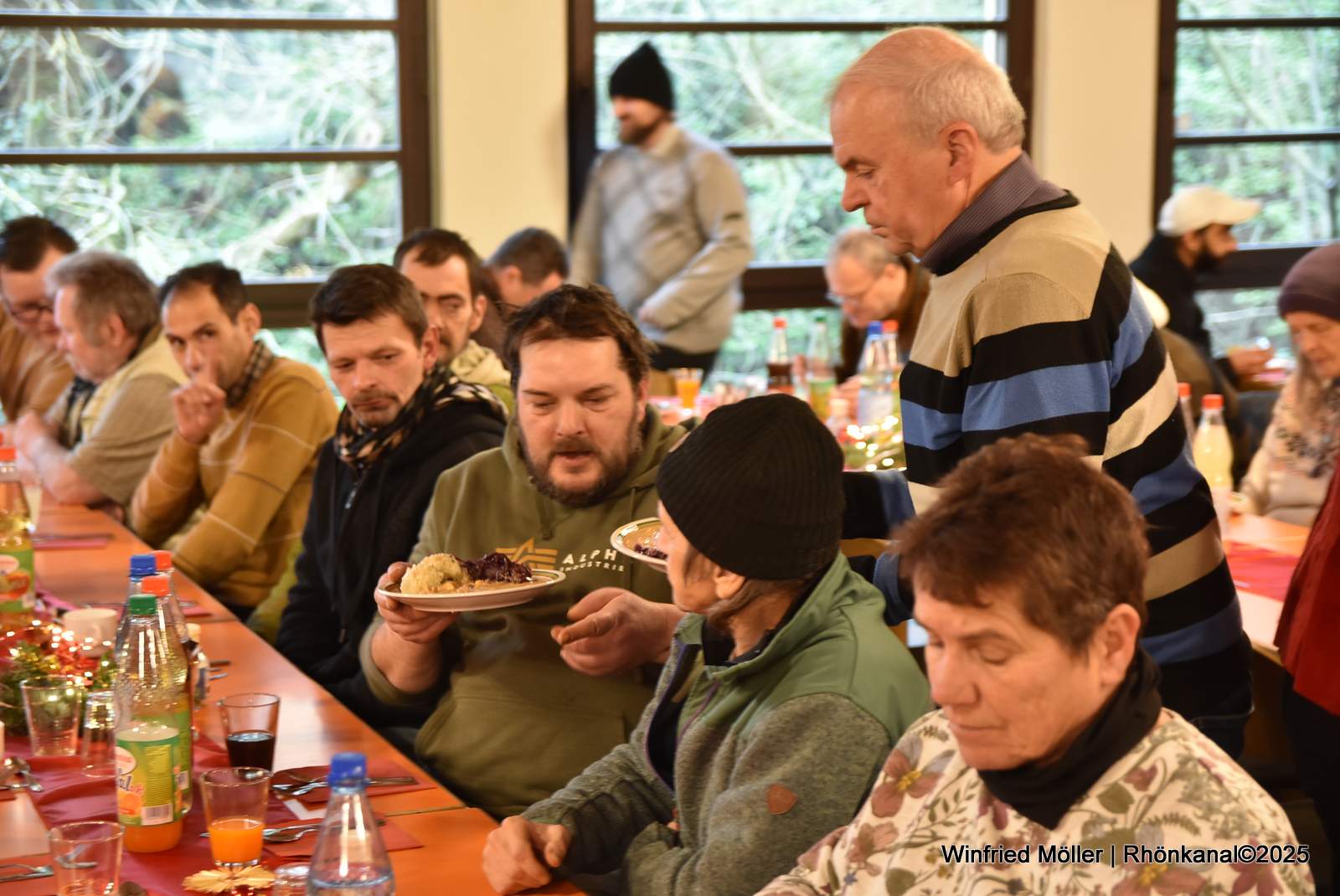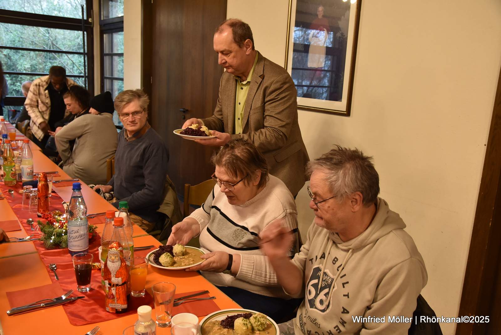 Die Heiligabendfeier begann mit dem festlichen Mittagessen. Es gab Hähnchengulasch mit Klösen und Rotkraut, sowie ein vegetarisches Gericht. Beides hatte die Firma Schneider, wie alljährlich, geliefert.