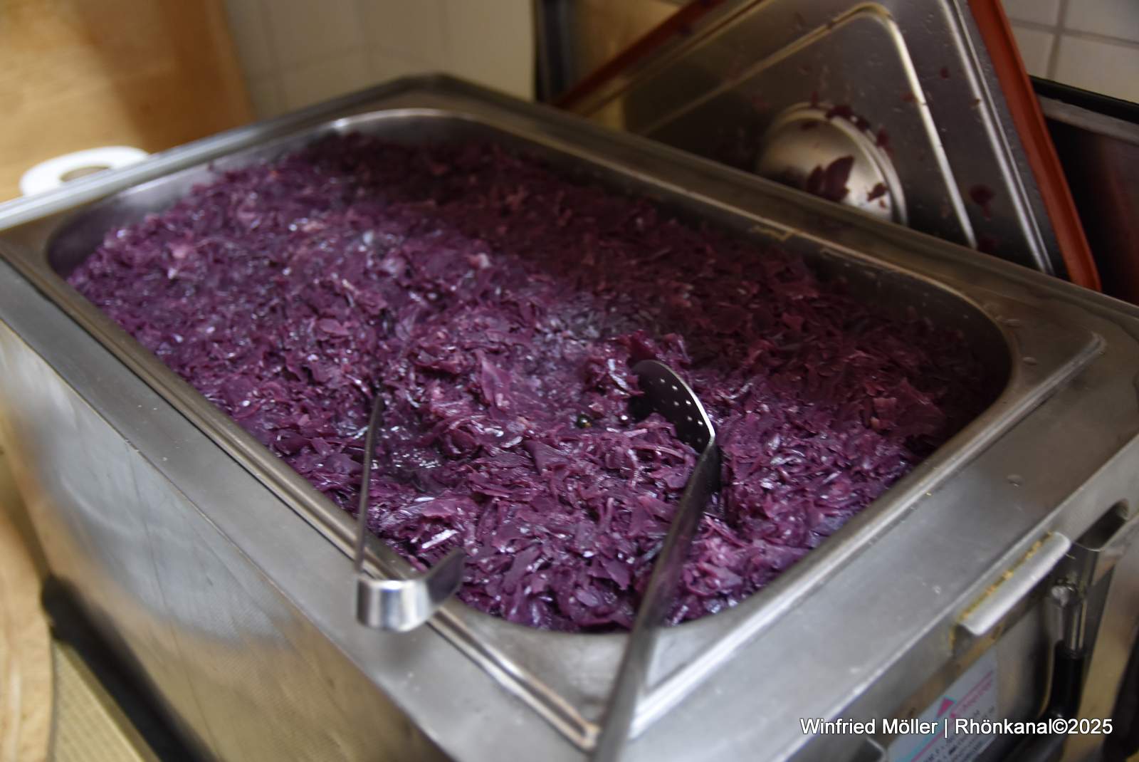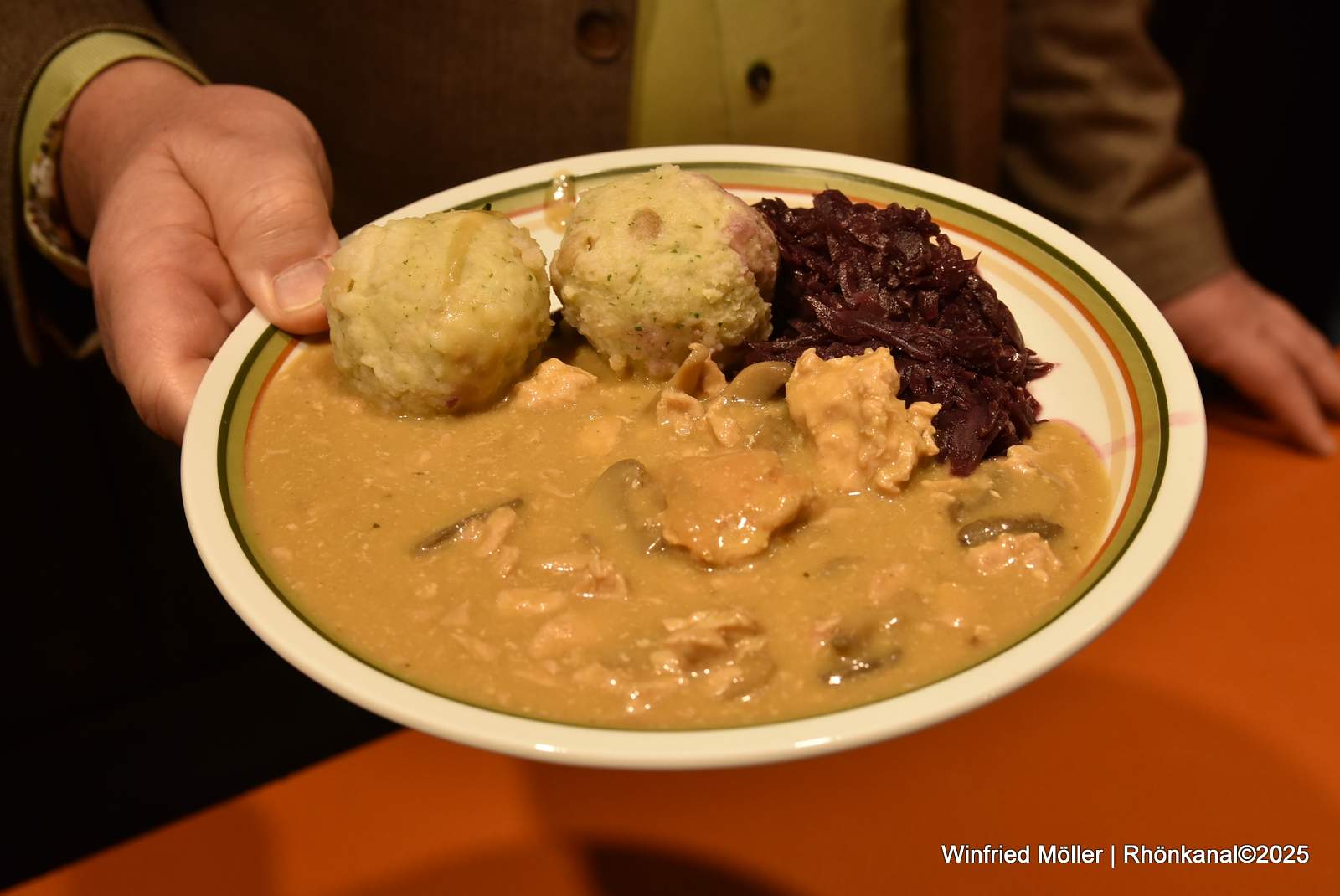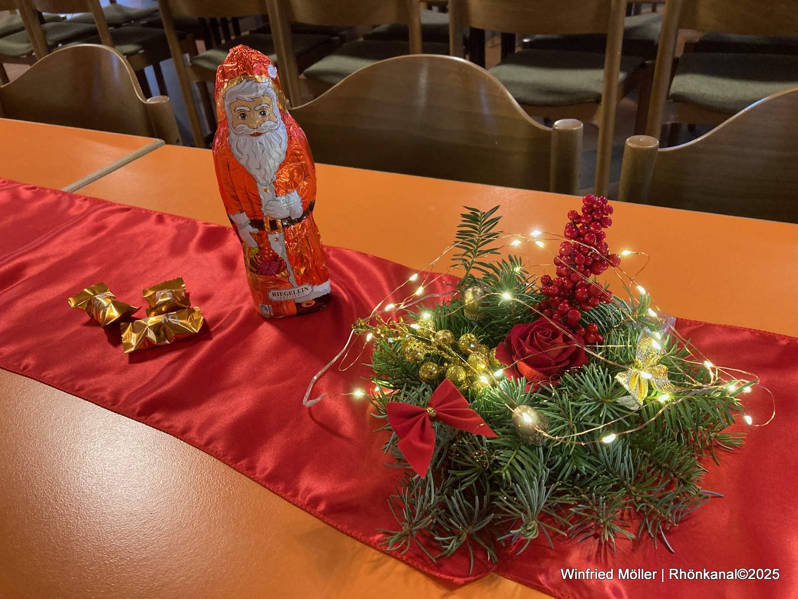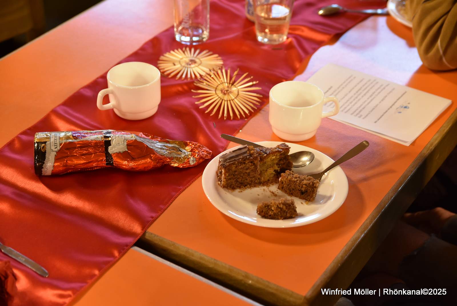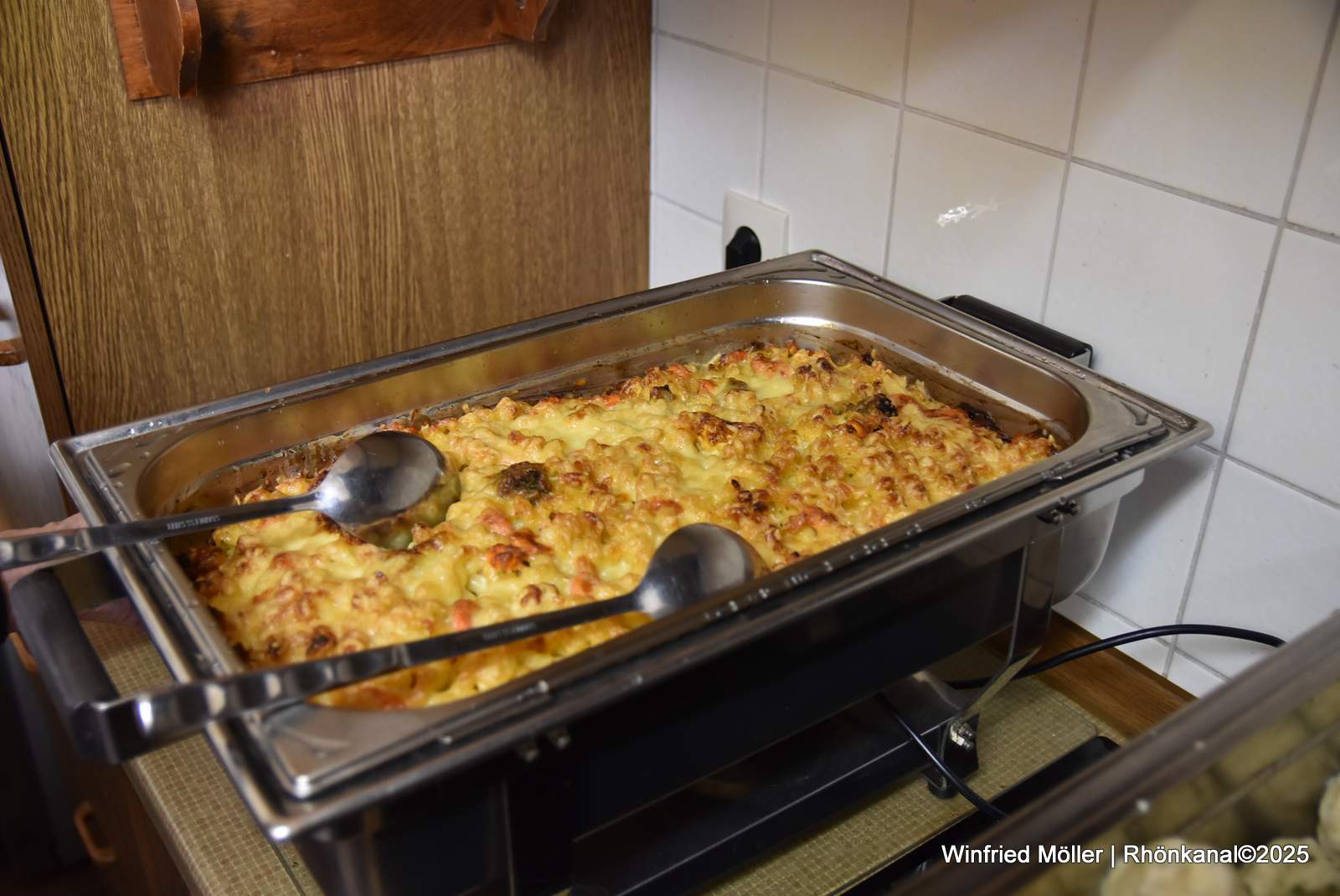 Die Heiligabendfeier begann mit dem festlichen Mittagessen. Es gab Hähnchengulasch mit Klösen und Rotkraut, sowie ein vegetarisches Gericht. Beides hatte die Firma Schneider, wie alljährlich, geliefert.