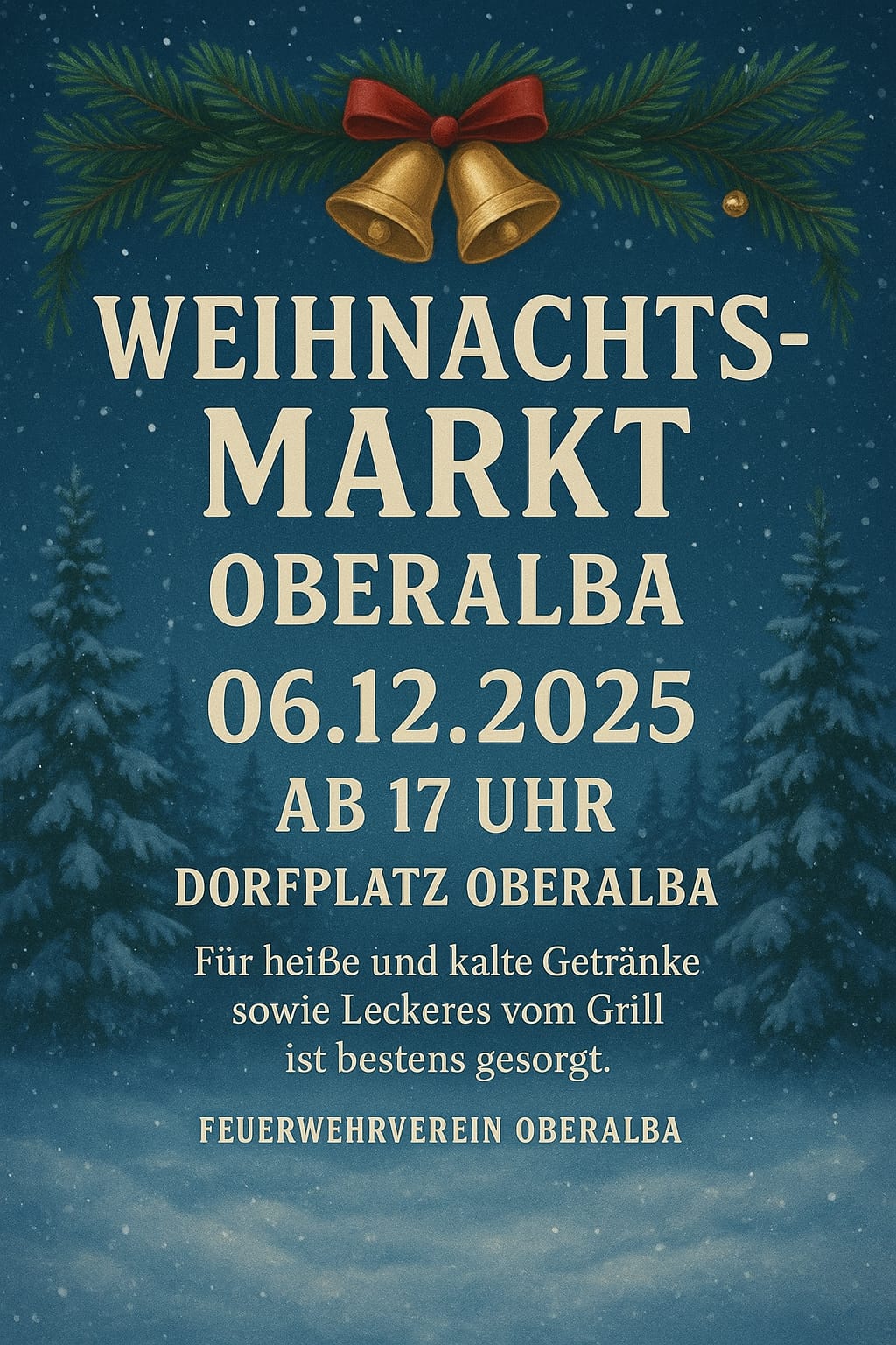 Der Feuerwehrverein Oberalba e.V. lädt auch in diesem Jahr zum alljährlichen Weihnachtsmarkt am Samstag, den 6.Dezember 2025, ein.