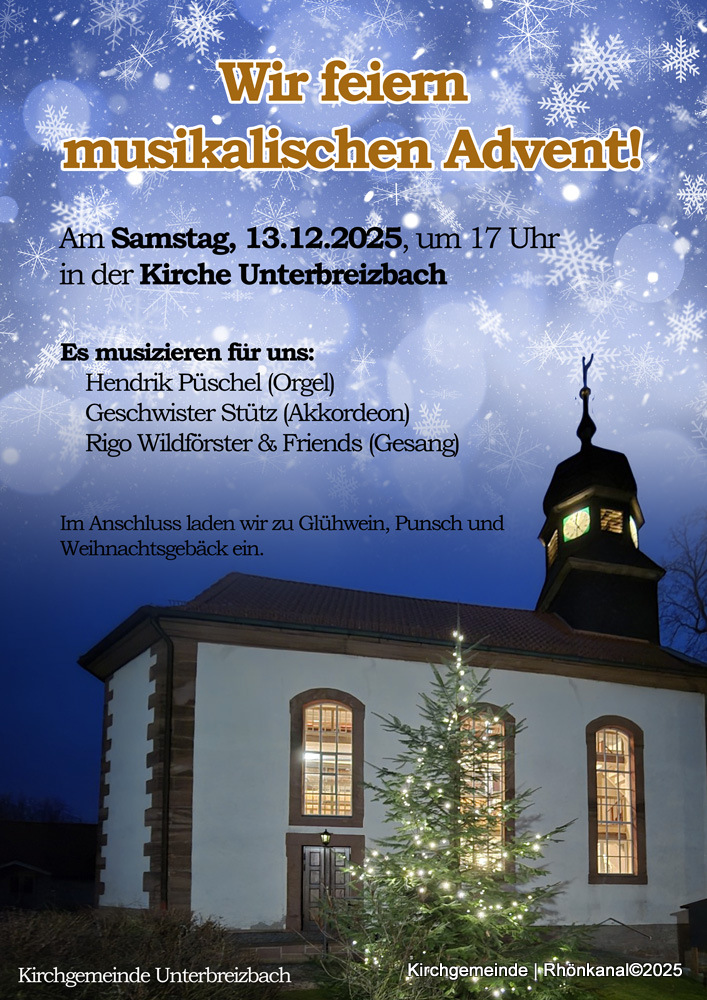 Am Samstag, den 13. Dezember 2025, wird zum musikalischen Advent eingeladen. In der Kirche in Unterbreizbach sind alle ab 17 Uhr herzlich willkommen.
