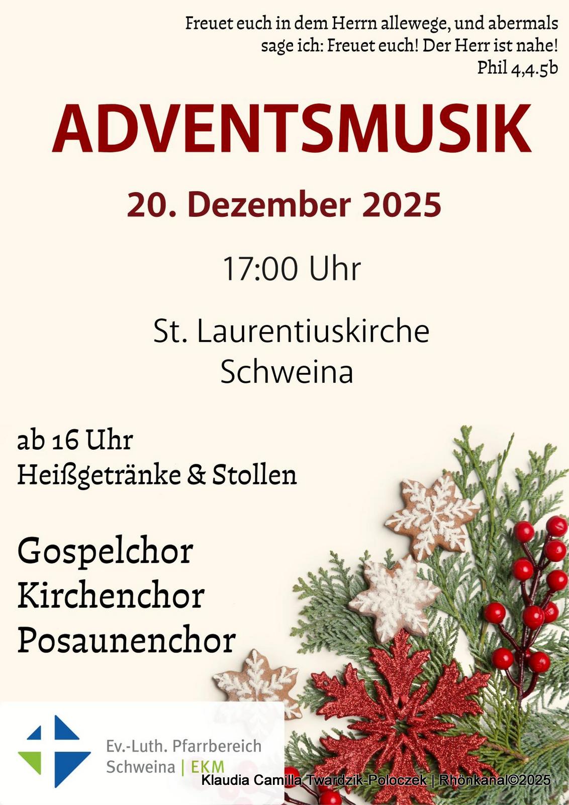 Am Samstag vor dem 4. Adventssonntag, dem 20. Dezember, um 17 Uhr interpretieren der Gospelchor, der Kirchenchor und der Posaunenchor Schweina bekannte Advents- und Weihnachtslieder in der St. Laurentiuskirche Schweina.
