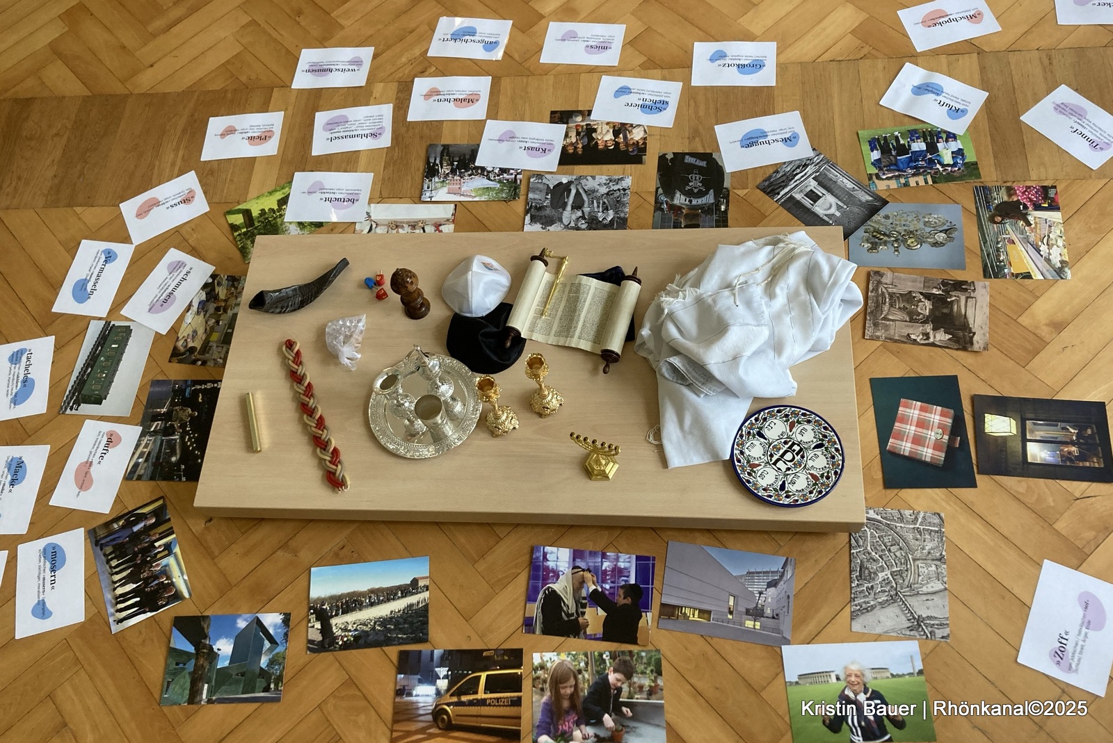 Auf einem Tisch lagen verschiedene religiöse und traditionelle Gegenstände, die man anschauen, anfassen und ausprobieren durfte, wie eine Menora, eine Thora-Rolle, Kippa, ein Widderhorn sowie typisches jüdisches Spielzeug.