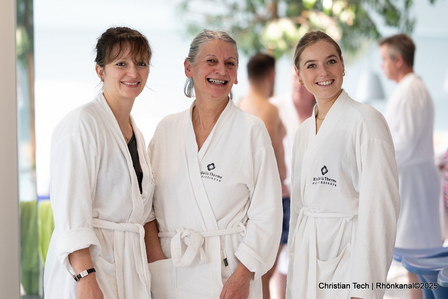 Der monatliche Austausch – sonst in einem der fünf Kurorte und Staatsbäder – fand im Rahmen einer Thermentour durch die beiden Landkreise Bad Kissingen und Rhön-Grabfeld statt. Und zwar stilecht im Bademantel und mit vollem Anwendungsprogramm vom Aquacycling bis zur Wassergymnastik.