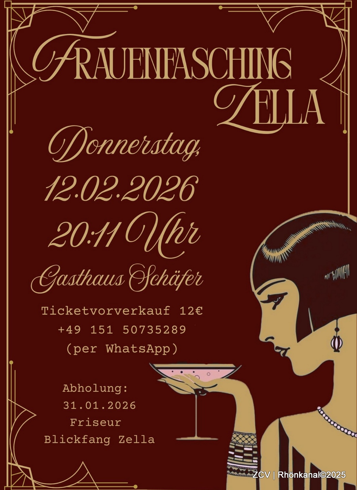 Die Damen übernehmen die Bühne am Donnerstag, 12. Februar 2026: Ab 20:11 Uhr lädt der ZCV zur Frauenfaschingsparty im Gasthaus Schäfer ein. Mit Musik, Programm und jeder Menge guter Laune wird bis spät in die Nacht gefeiert.