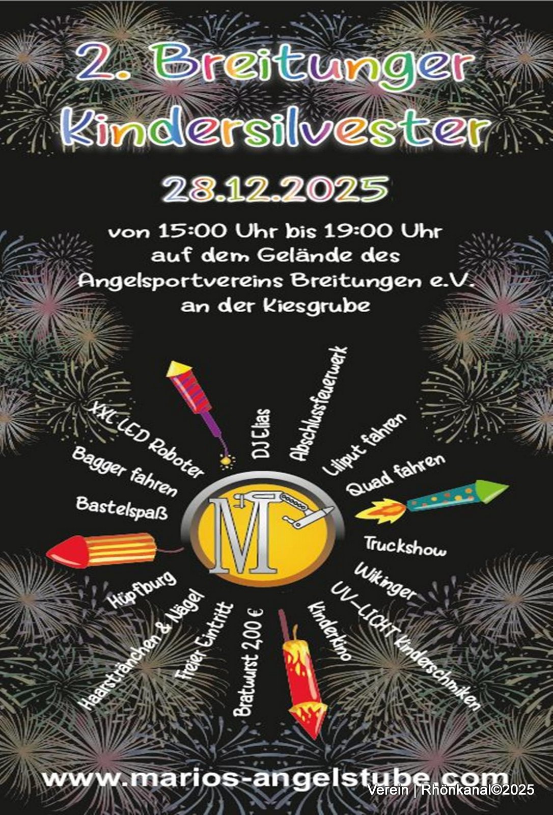 Nach dem wirklich gelungen 1. Breitunger Kindersilvester 2024 geht nun die Planung zweite Runde: Am Sonntag, den 28. Dezeember 2025 geht das Team vom „Pyrospektakel Breitungen“ in die zweite Runde des „Breitunger Kindersilvesters“.