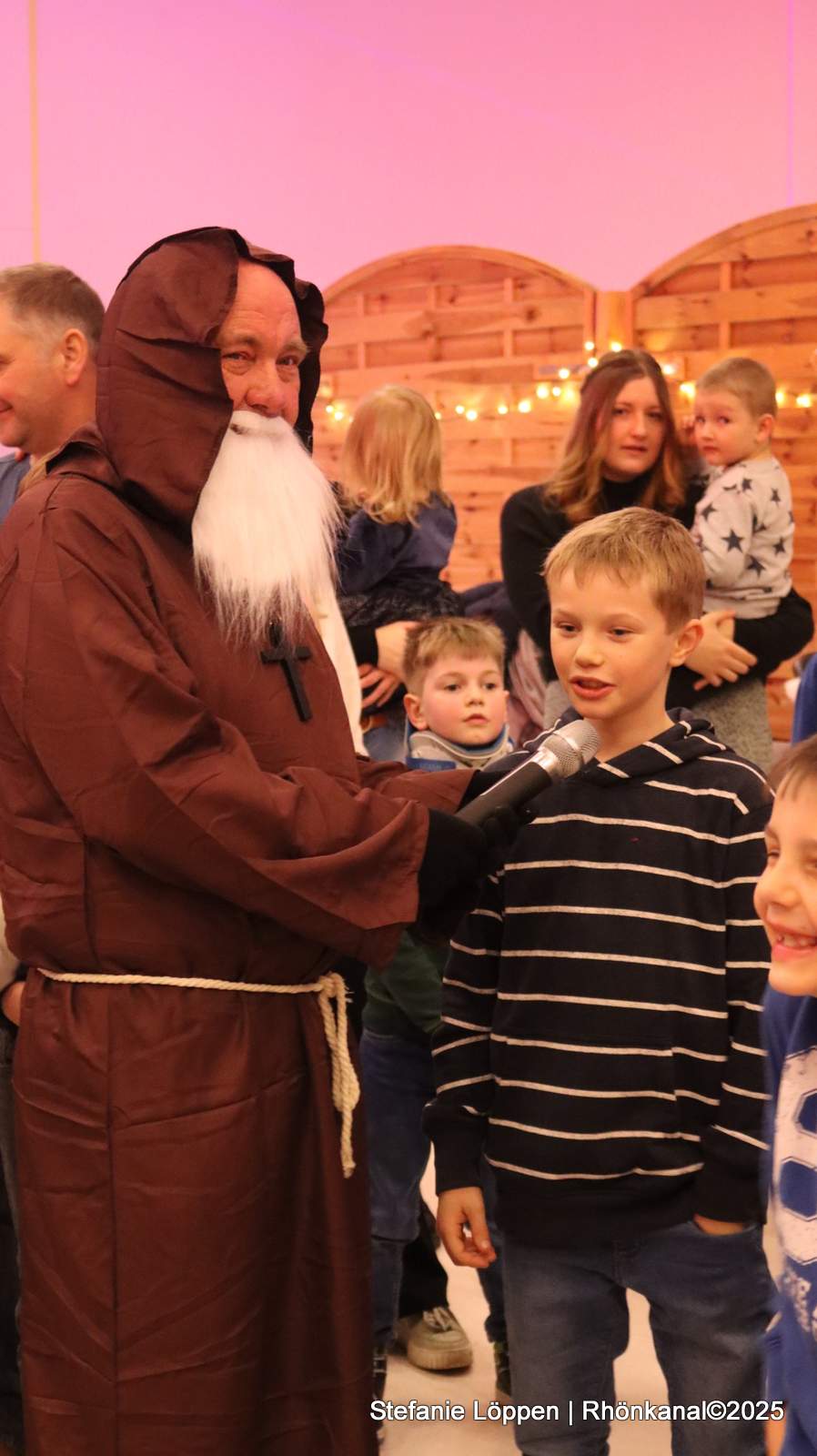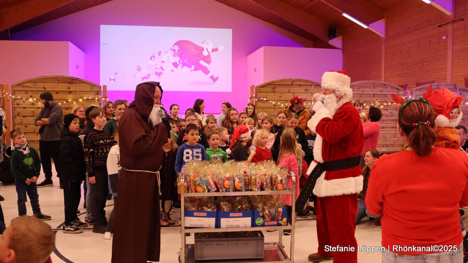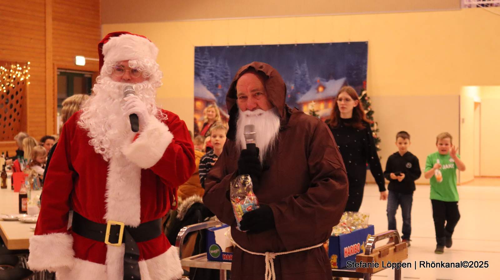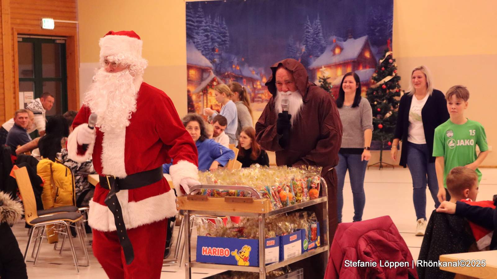 Gegen 18 Uhr wurde es dann still im Saal: Wie jedes Jahr zogen Nikolaus und Knecht Ruprecht in die Hochrhönhalle ein. Die beiden historischen Figuren – der heilige Nikolaus von Myra, seit Jahrhunderten als Schutzpatron der Kinder verehrt, und sein traditioneller Begleiter Ruprecht, der in alten Erzählungen mahnt, tadelt, aber meist doch ein Herz für die Kleinen hat – wurden sofort von neugierigen Blicken empfangen.