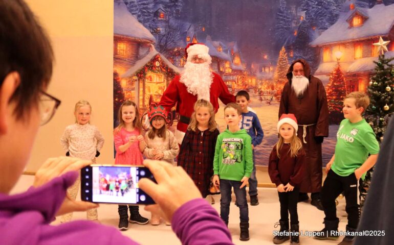 Gegen 18 Uhr wurde es dann still im Saal: Wie jedes Jahr zogen Nikolaus und Knecht Ruprecht in die Hochrhönhalle ein. Die beiden historischen Figuren – der heilige Nikolaus von Myra, seit Jahrhunderten als Schutzpatron der Kinder verehrt, und sein traditioneller Begleiter Ruprecht, der in alten Erzählungen mahnt, tadelt, aber meist doch ein Herz für die Kleinen hat – wurden sofort von neugierigen Blicken empfangen.