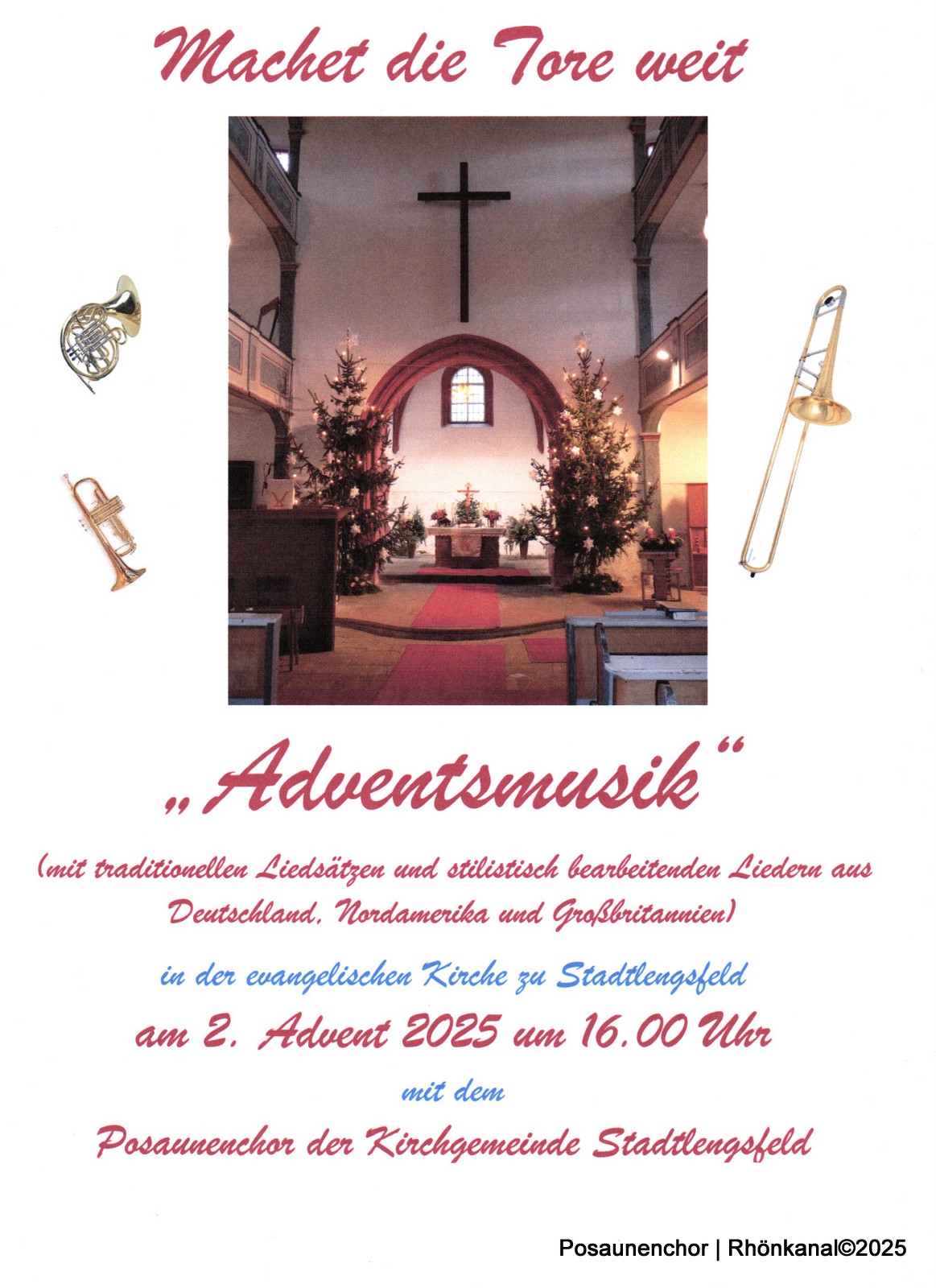 Unter dem Motto "Machet die Tore weit" lädt der Posaunenchor Stadtlengsfeld am 2. Advent um 16 Uhr zu einer Adventsmusik in die evangelische Kirche ein.