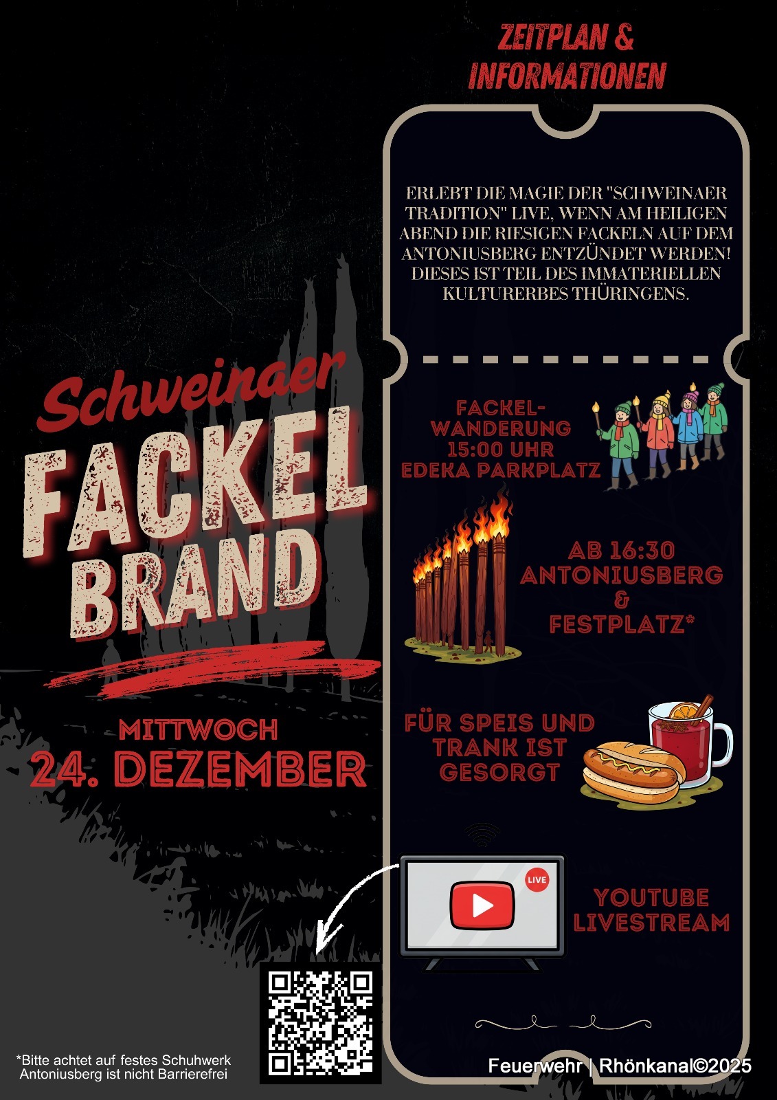 Der Freiwillige Feuerwehr Schweina e.V. lädt am 24. Dezember 2025 herzlich zum Fackelbrand ein. Der Fackelbrand zählt zum immaterielle Kulturerbe.