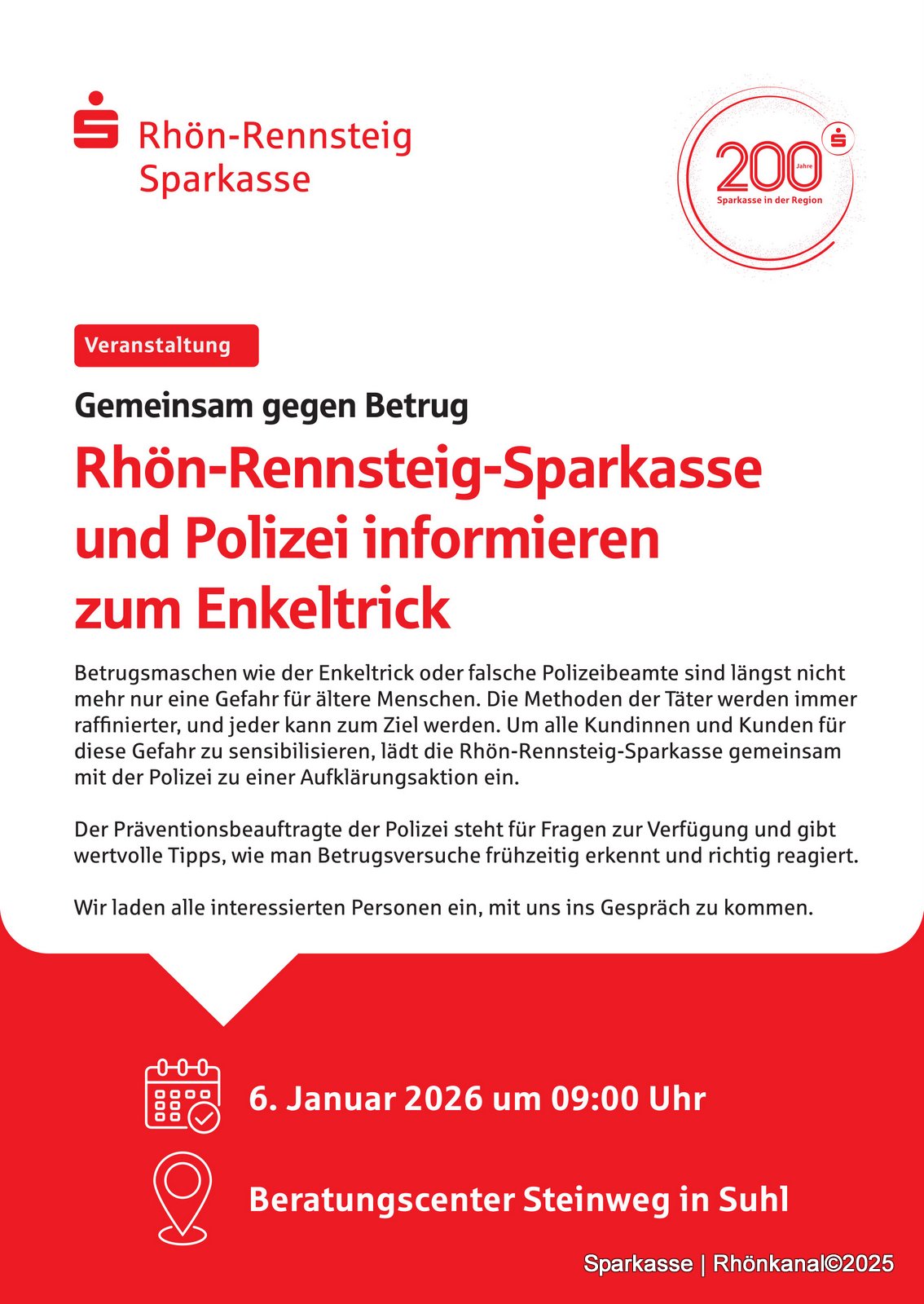 Um alle Kundinnen und Kunden für diese Gefahr zu sensibilisieren, lädt die Rhön-Rennsteig-Sparkasse gemeinsam mit der Polizei am Dienstag, den 6. Januar 2026 zu einer Aufklärungsaktion ins Beratungscenter im Steinweg in Suhl ein.