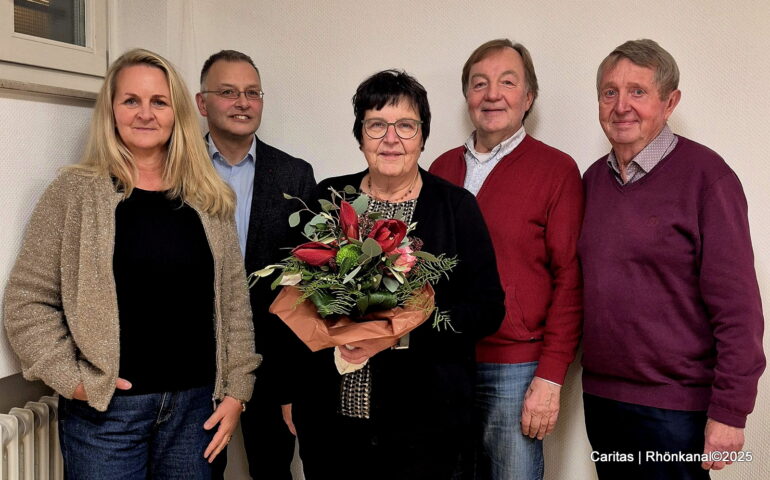 Susanne Saradj, der Vorstandsvorsitzende Raimund Kind sowie die Vorstandsmitglieder Thomas Engel und Stephan Büttner danken der Jubilarin für die fruchtbare Zusammenarbeit und die wertvolle Unterstützung der Caritas Arbeit.
