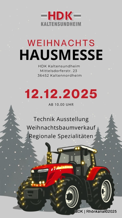 Die HDK Kaltensundheim GmbH lädt am Freitag, den 12. Dezember 2025, zur Weihnachts-Hausmesse ein. Ab 10 Uhr gibt es auf dem Gelände viel zu sehen.