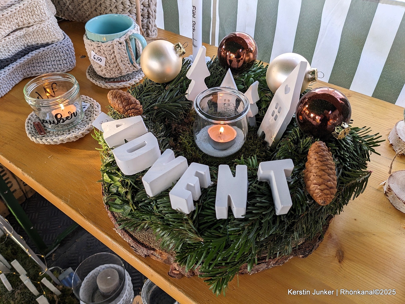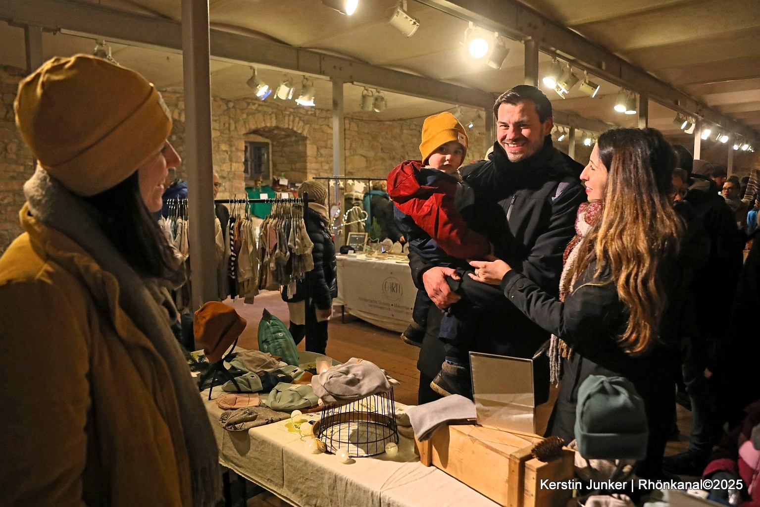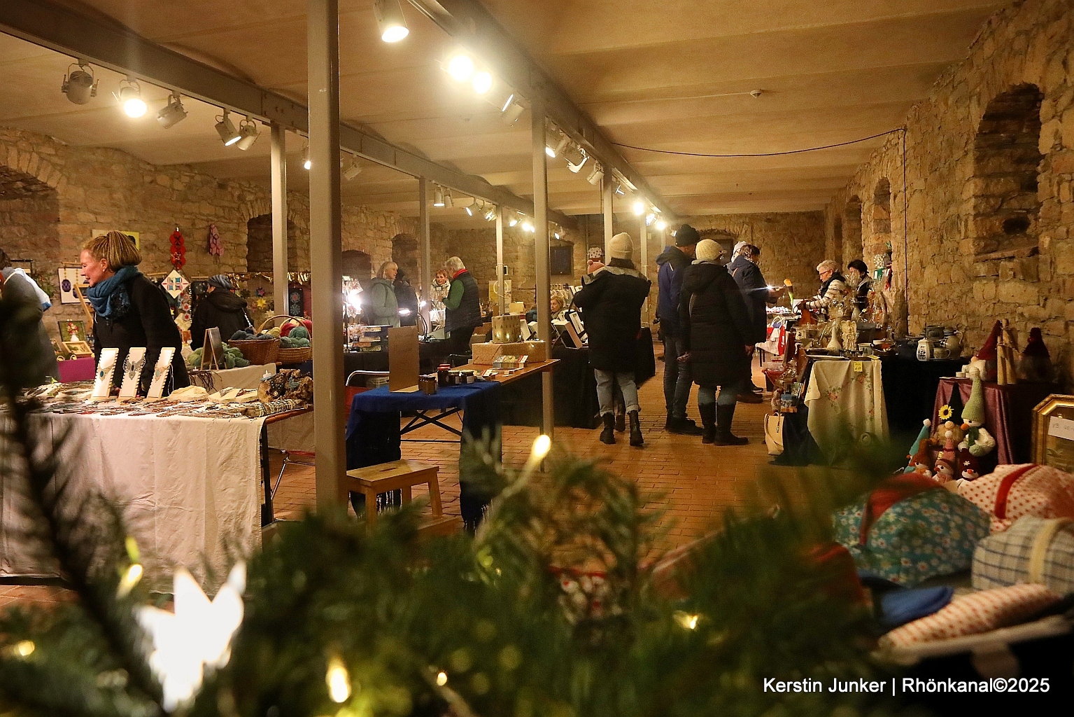 Im Außen- und Innenbereich können Gäste über den Weihnachtsmarkt bummeln. Hier locken über dreißig Stände mit handgefertigten Produkten wie Kerzen, Seifen, Kleidung, Schmuck und Weihnachtsdeko aus Holz.