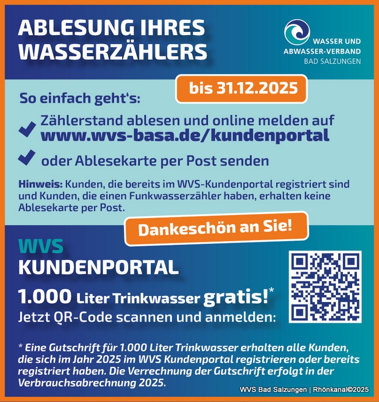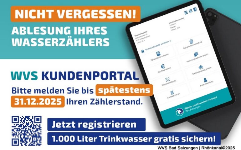 Der Wasser und Abwasser-Verband Bad Salzungen (WVS) bittet alle Kunden, den Zählerstand des Wasserzählers für die Verbrauchsabrechnung 2025 zu melden. Der Zählerstand wird ganz einfach im Kundenportal unter www.wvs-basa.de/kundenportal übermittelt. Alternativ kann die Ablesekarte ausgefüllt und per Post zurück an den WVS geschickt werden.
